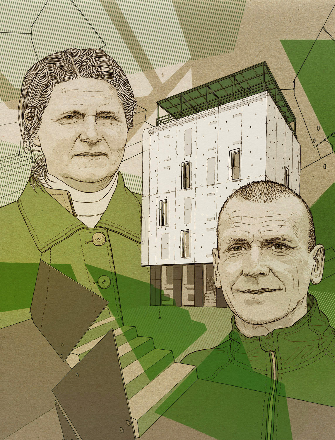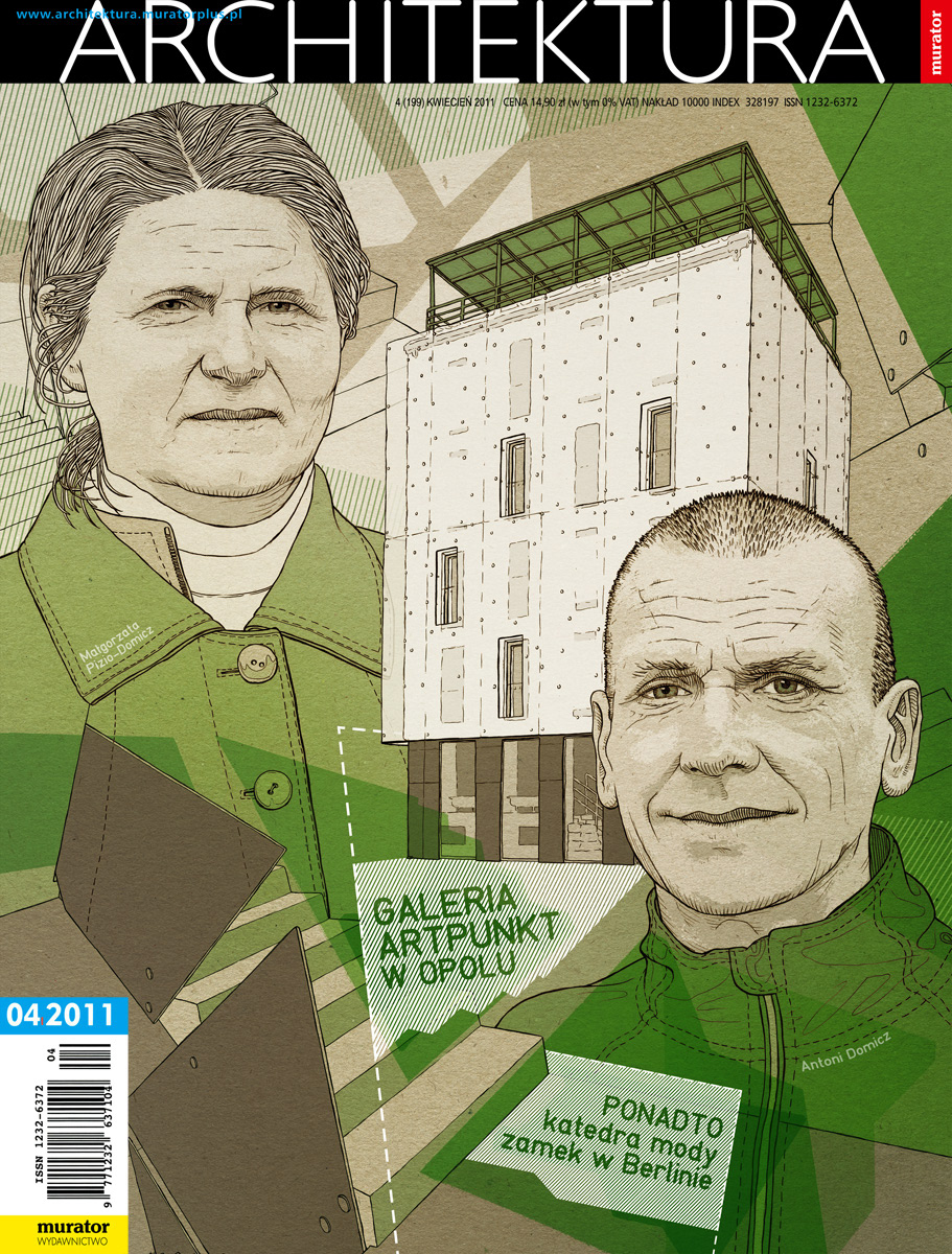 The cover for Architektura magazine. The portrayed people are Malgorzata Pizio-Domicz and Antoni Domicz who designed the Center of Art Education in Opole. As the building is almost entirely covered with glass, a selective transparent varnish has been applied on the cover to highlight it.