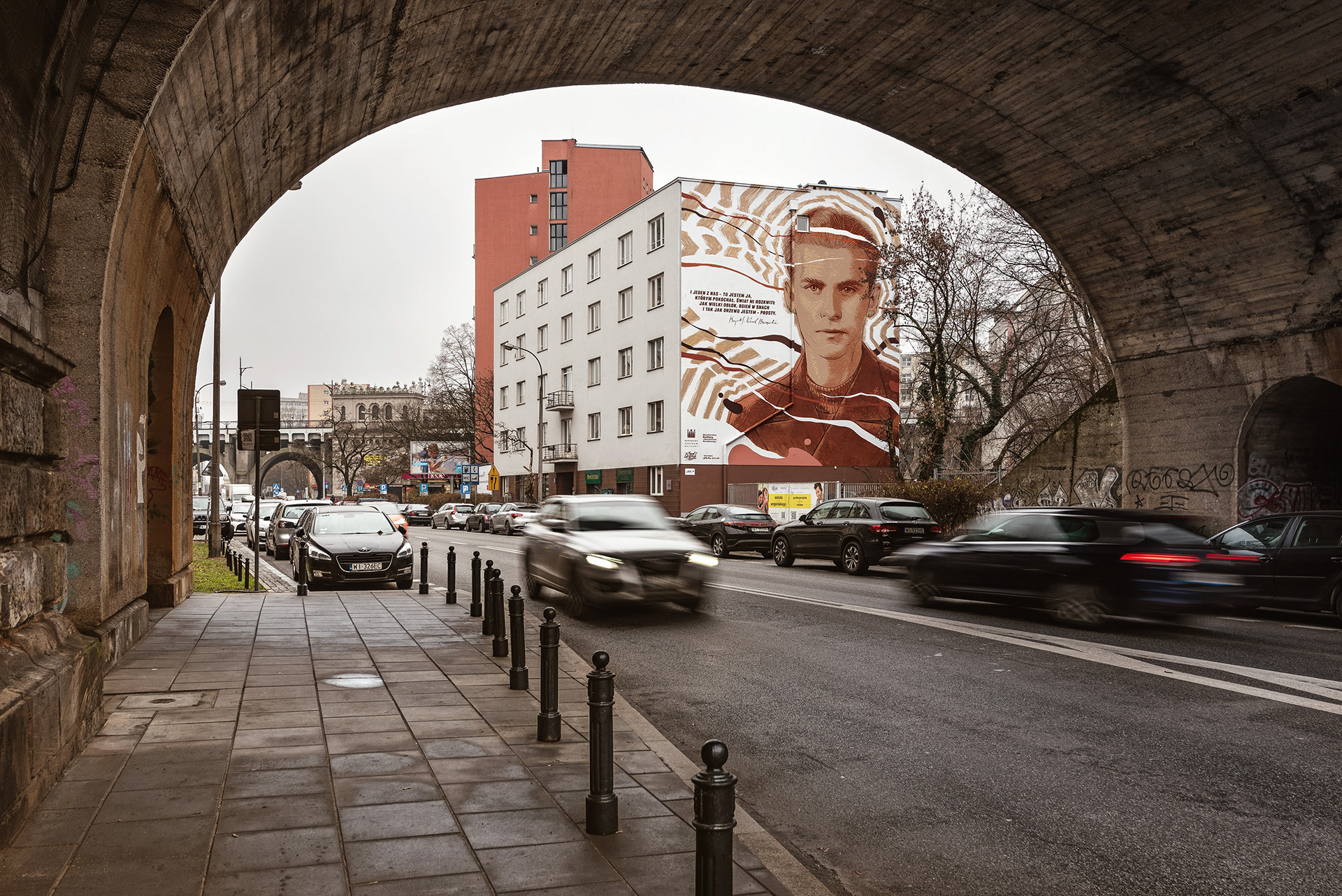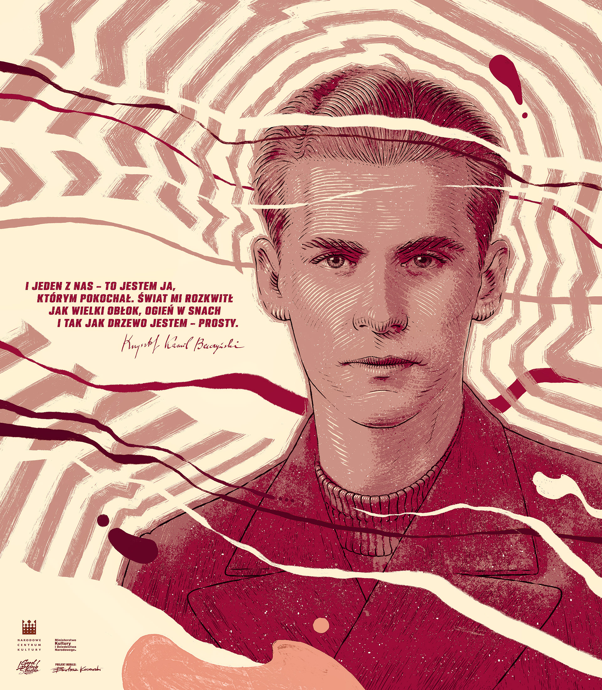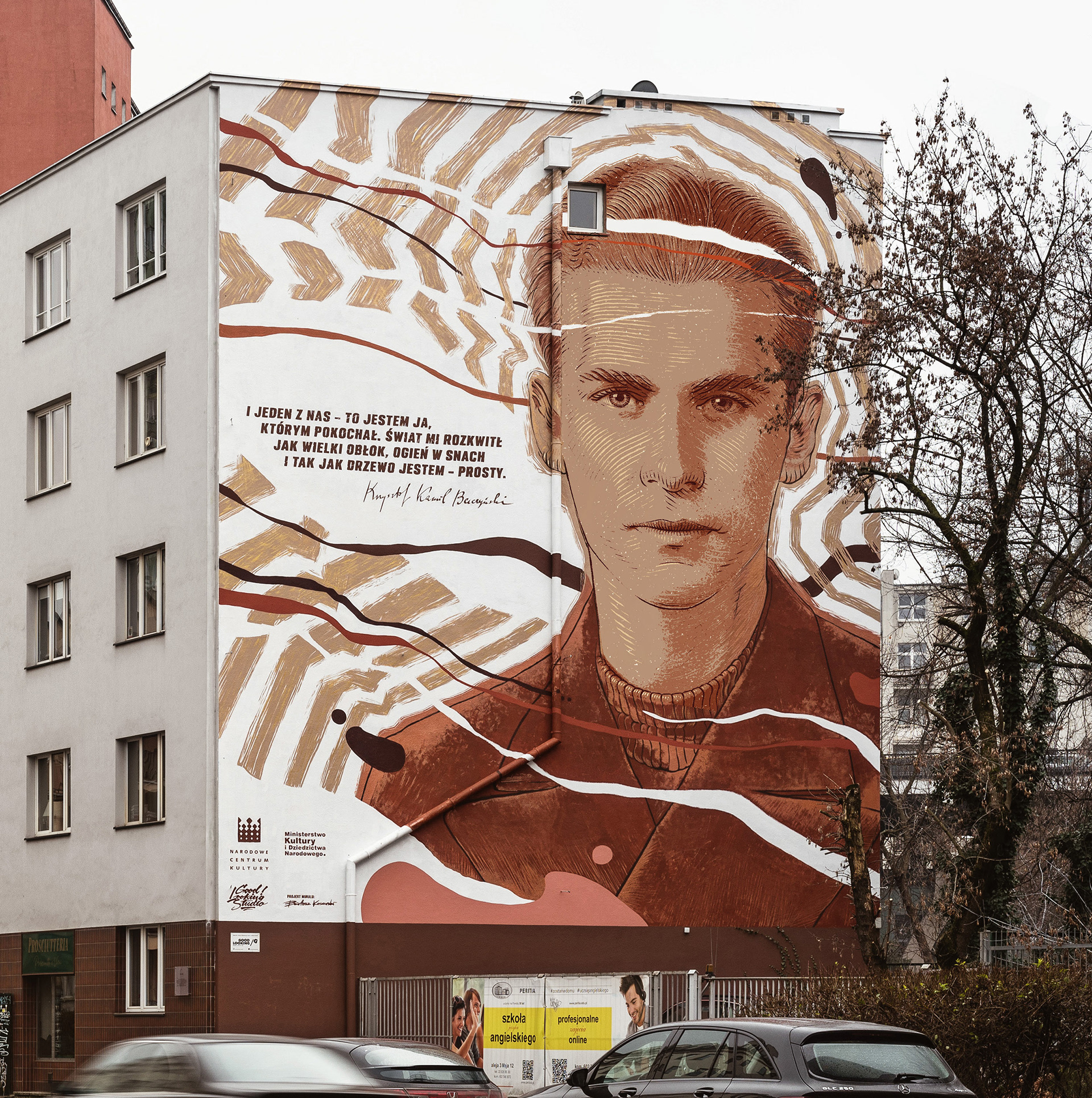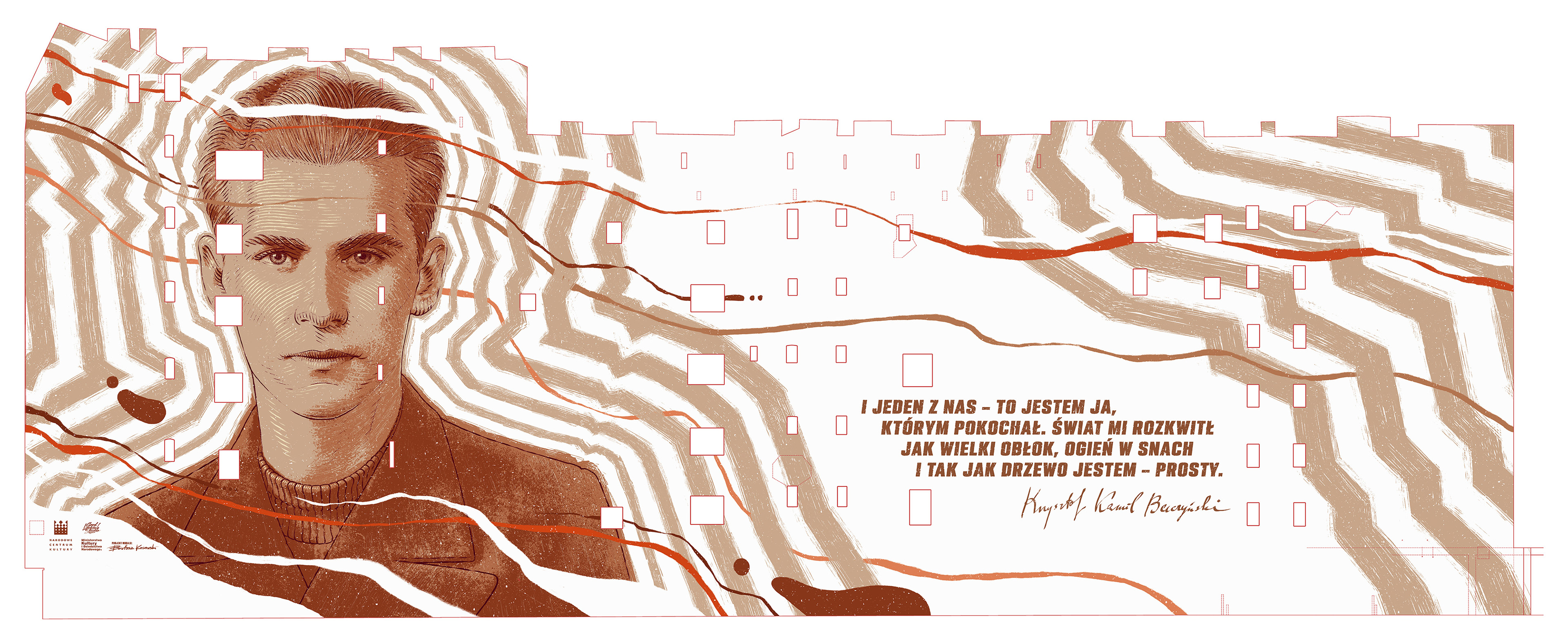 A mural illustration depicting polish poet Krzysztof Kamil Baczynski.