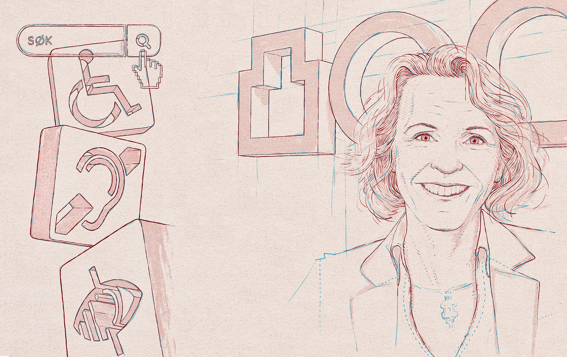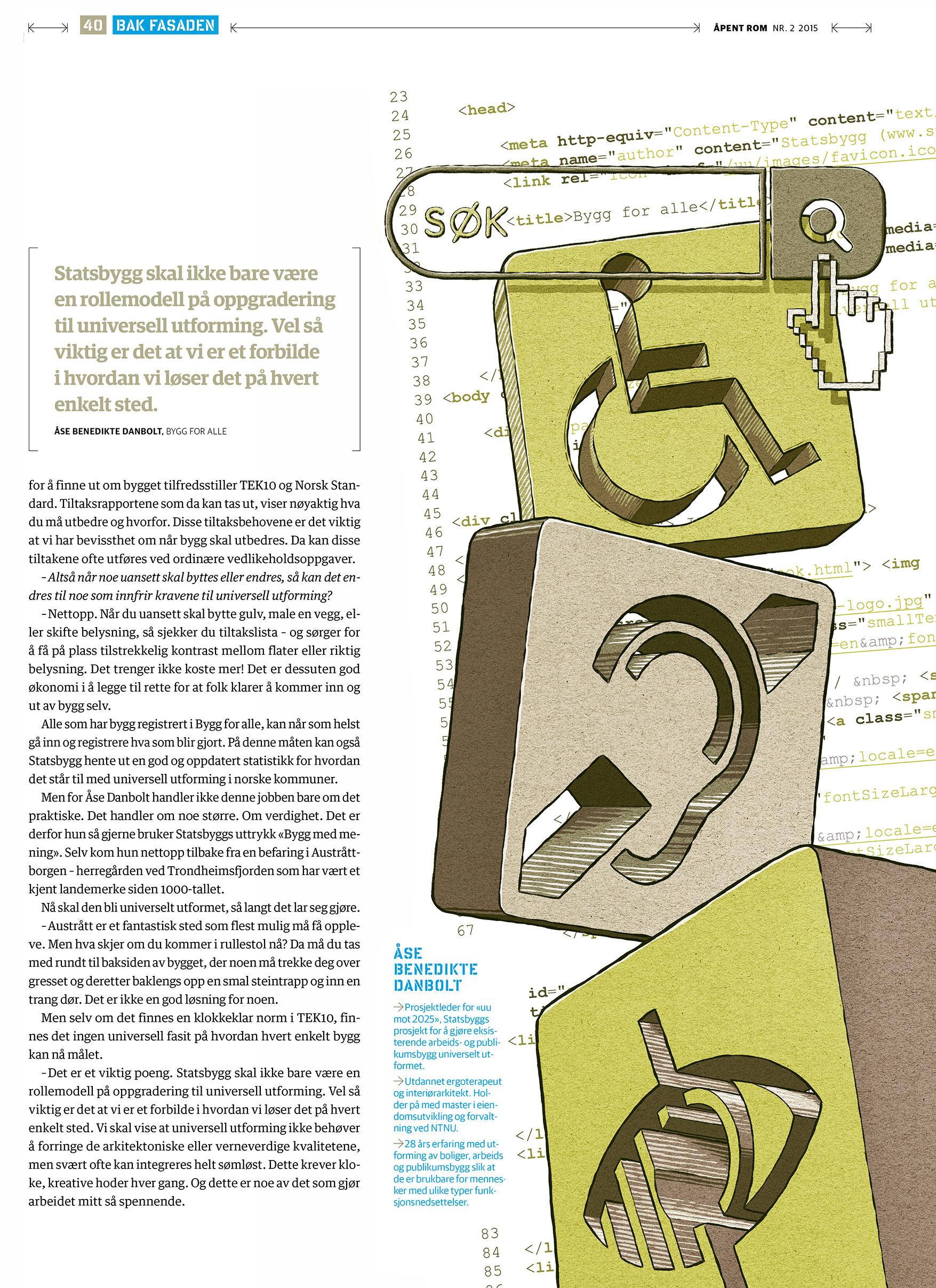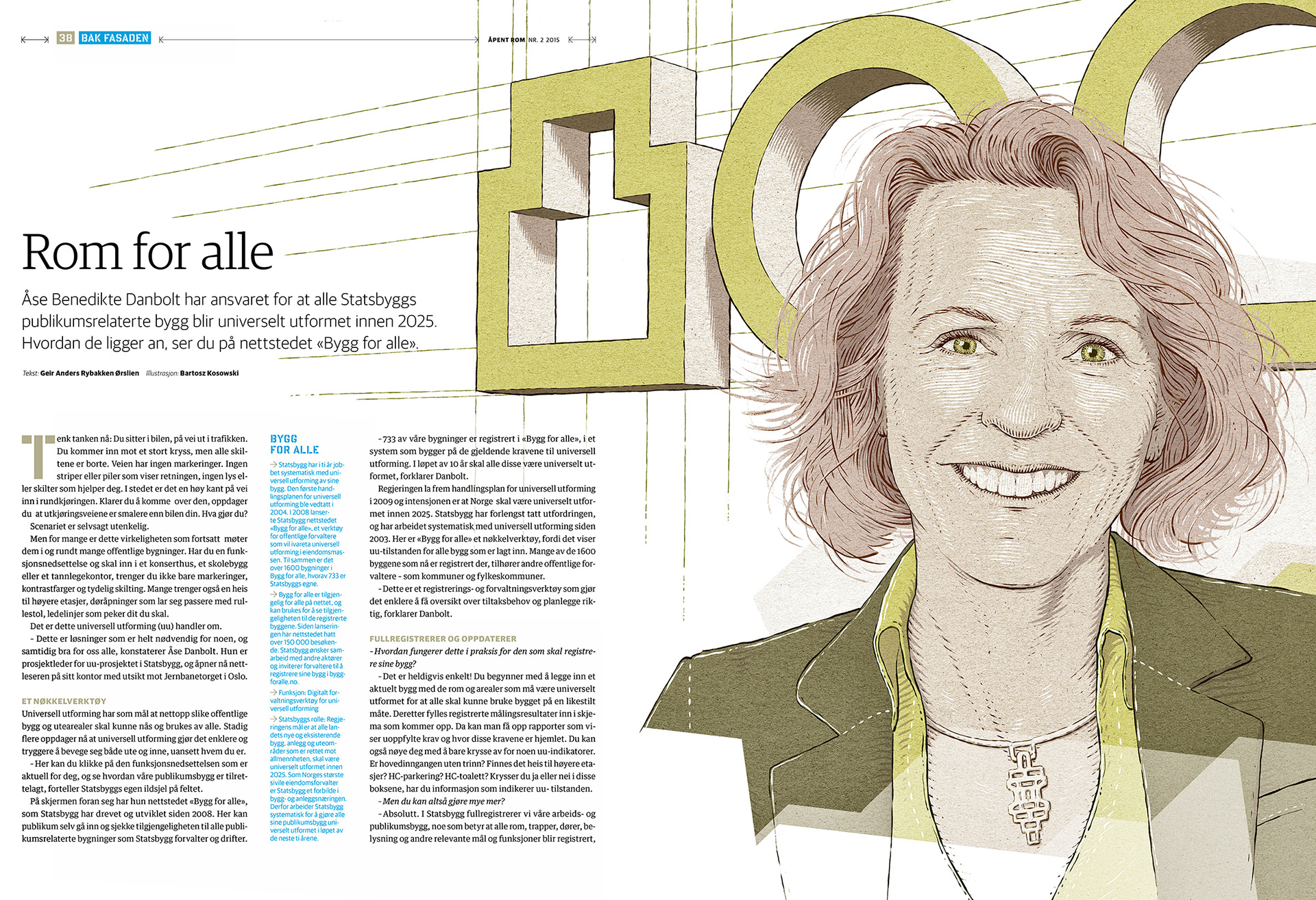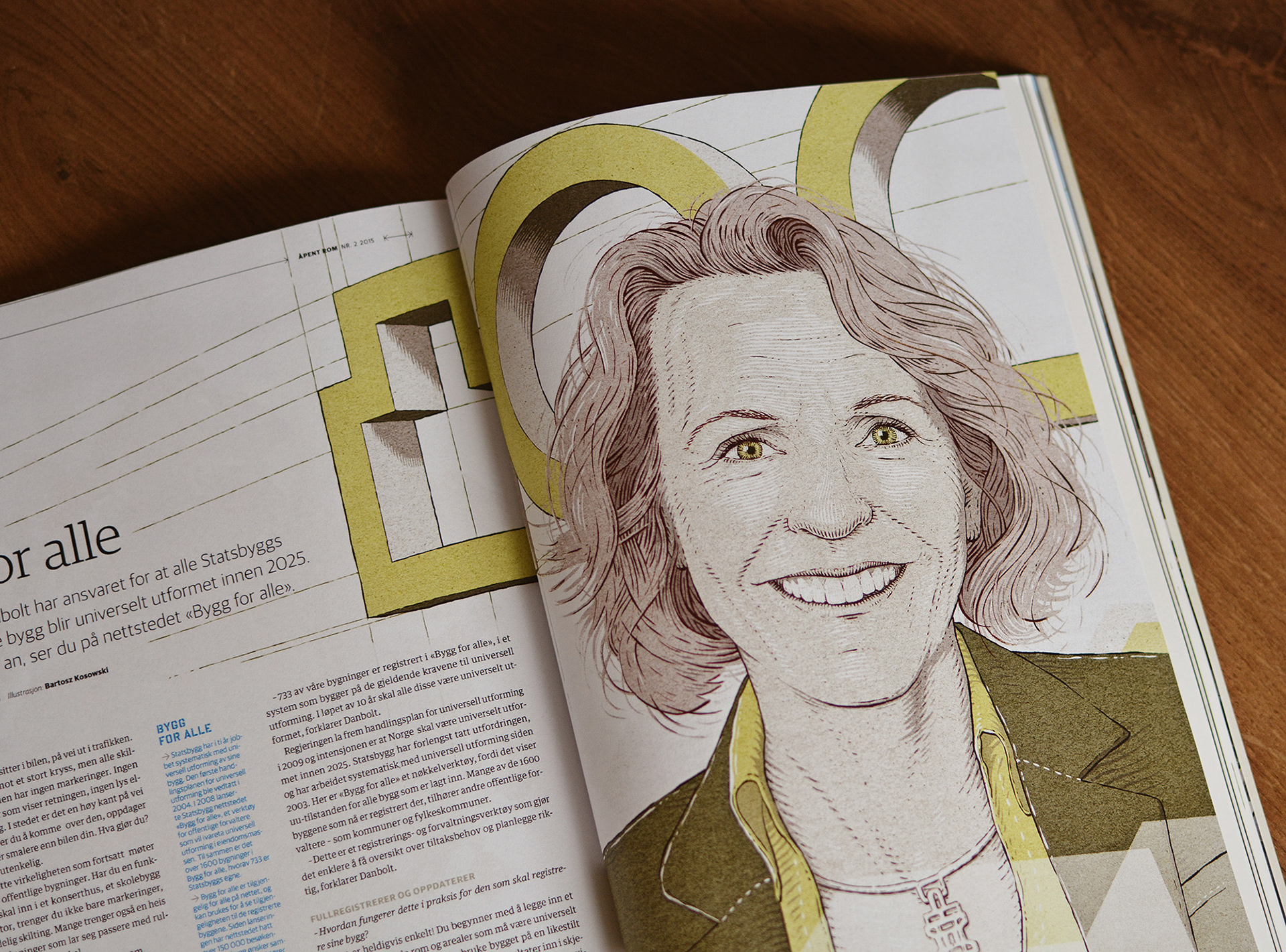 A portrait of Åse Benedikte Danbolt and the illustration depicting the Bygg for Alle website (which provides information about accessibility to public spaces in most of the Norwegian public buildings ). Published in "Åpent Rom" magazine.