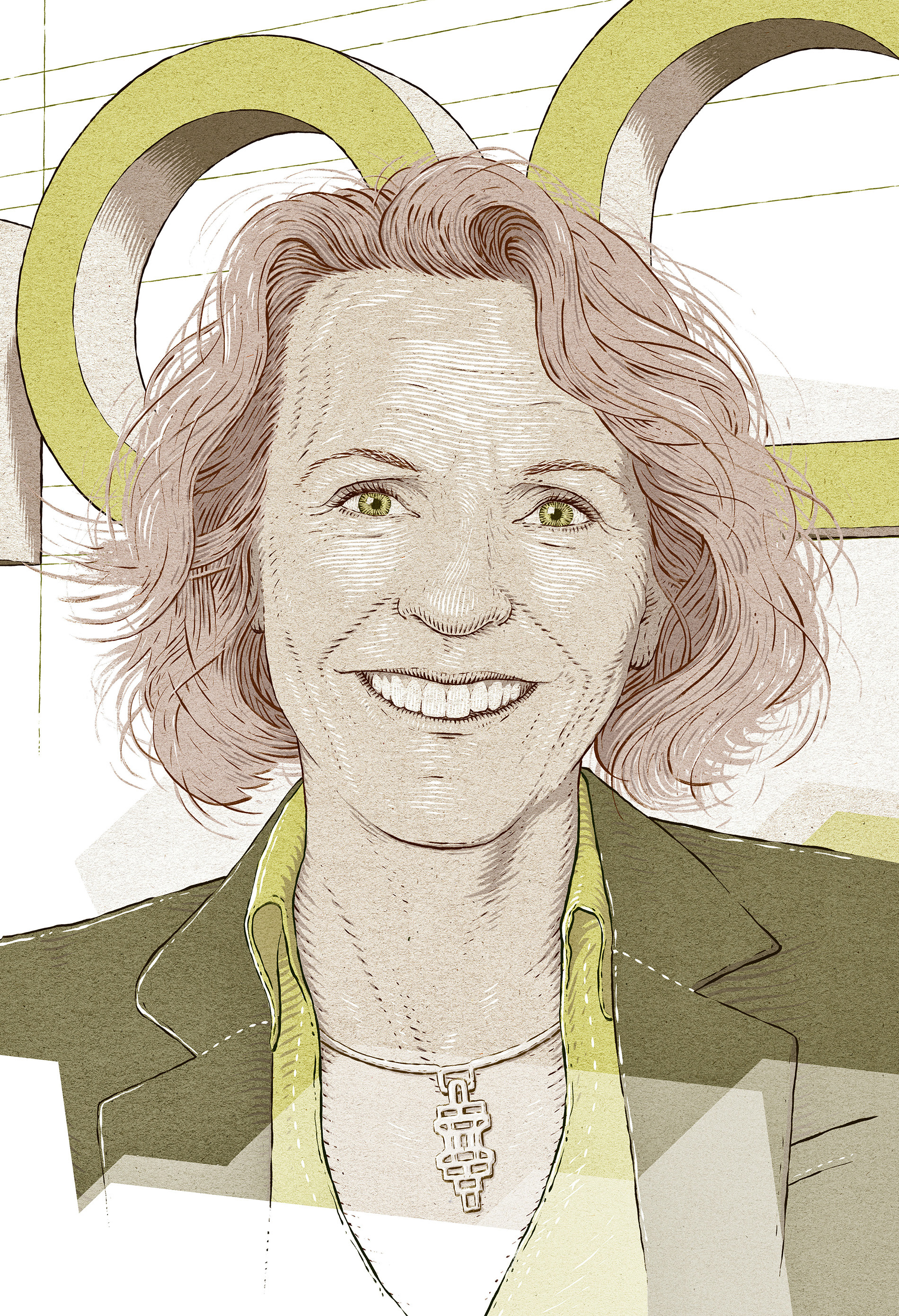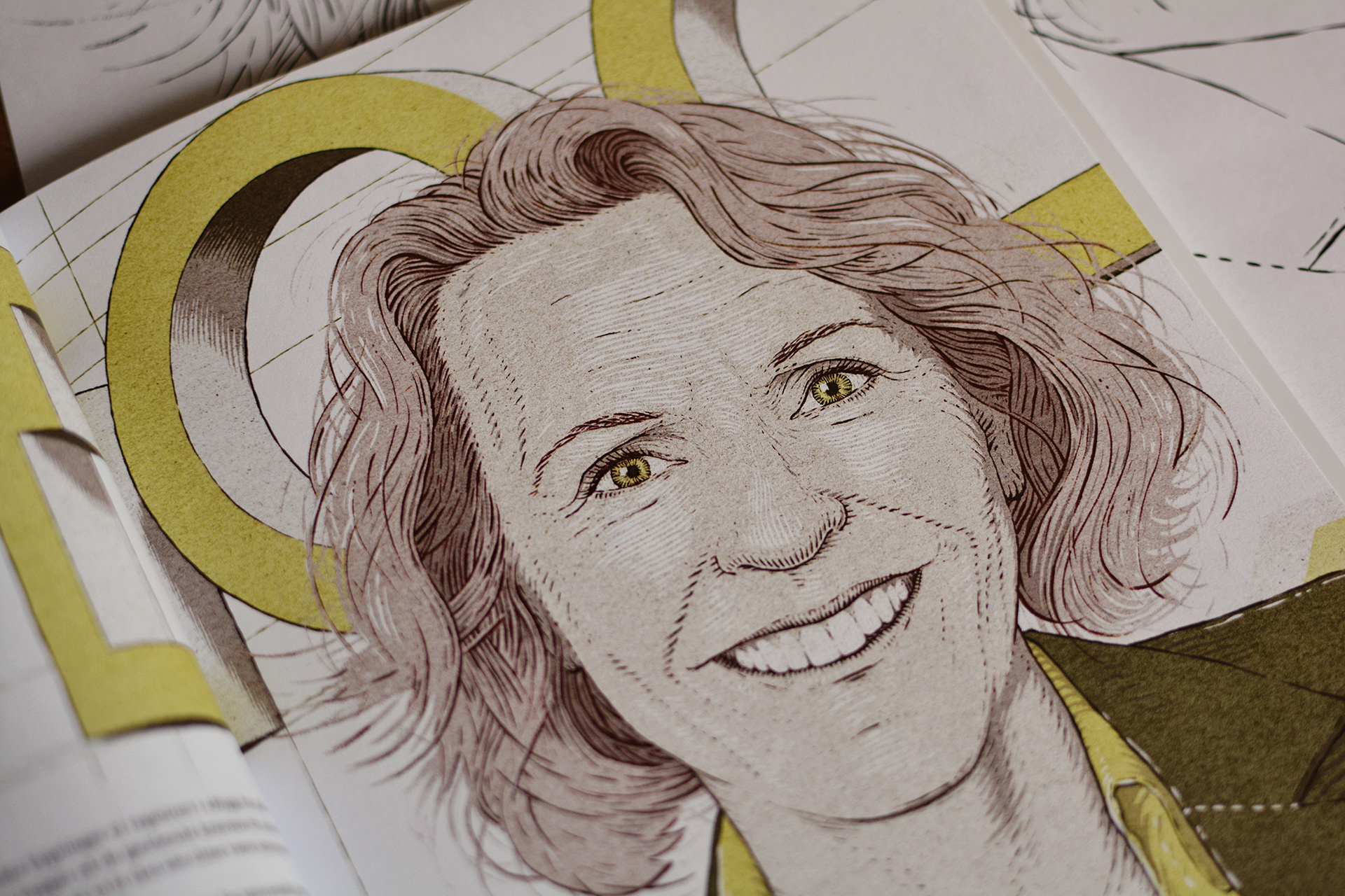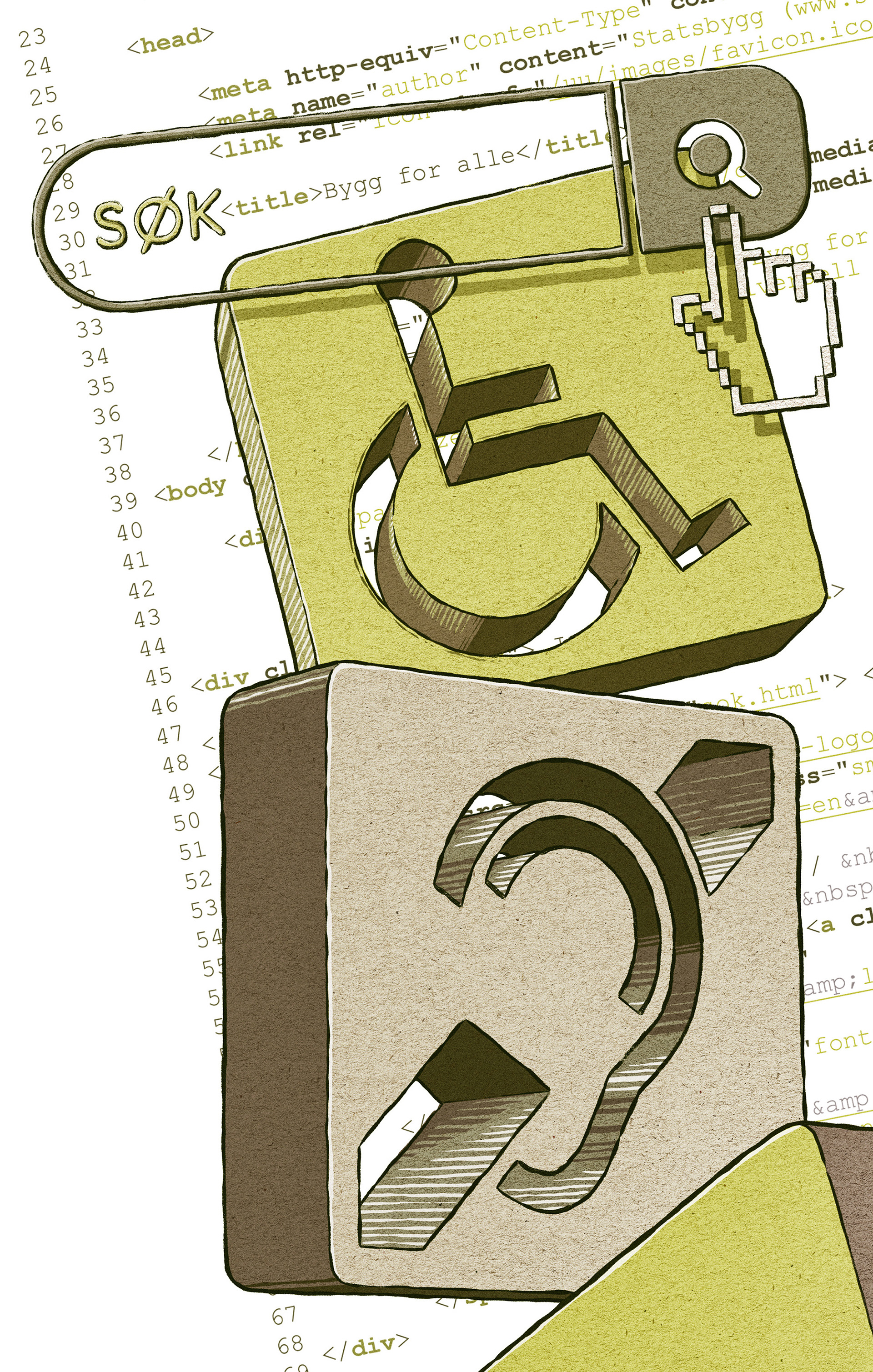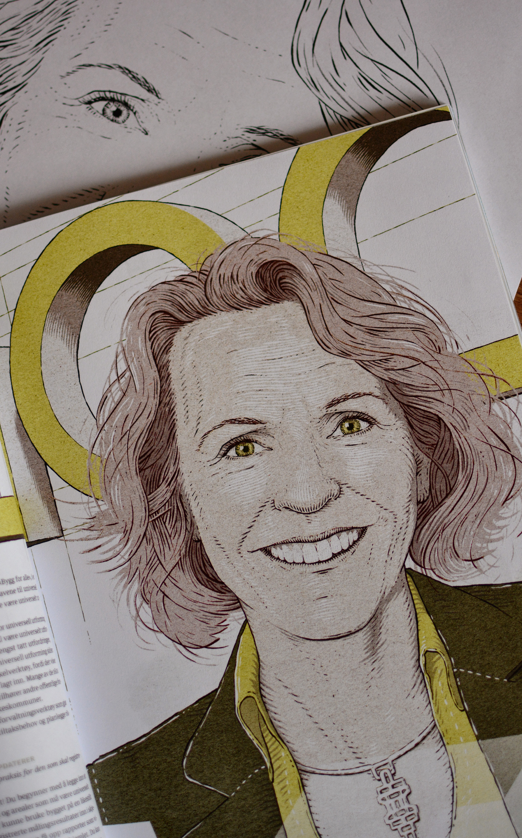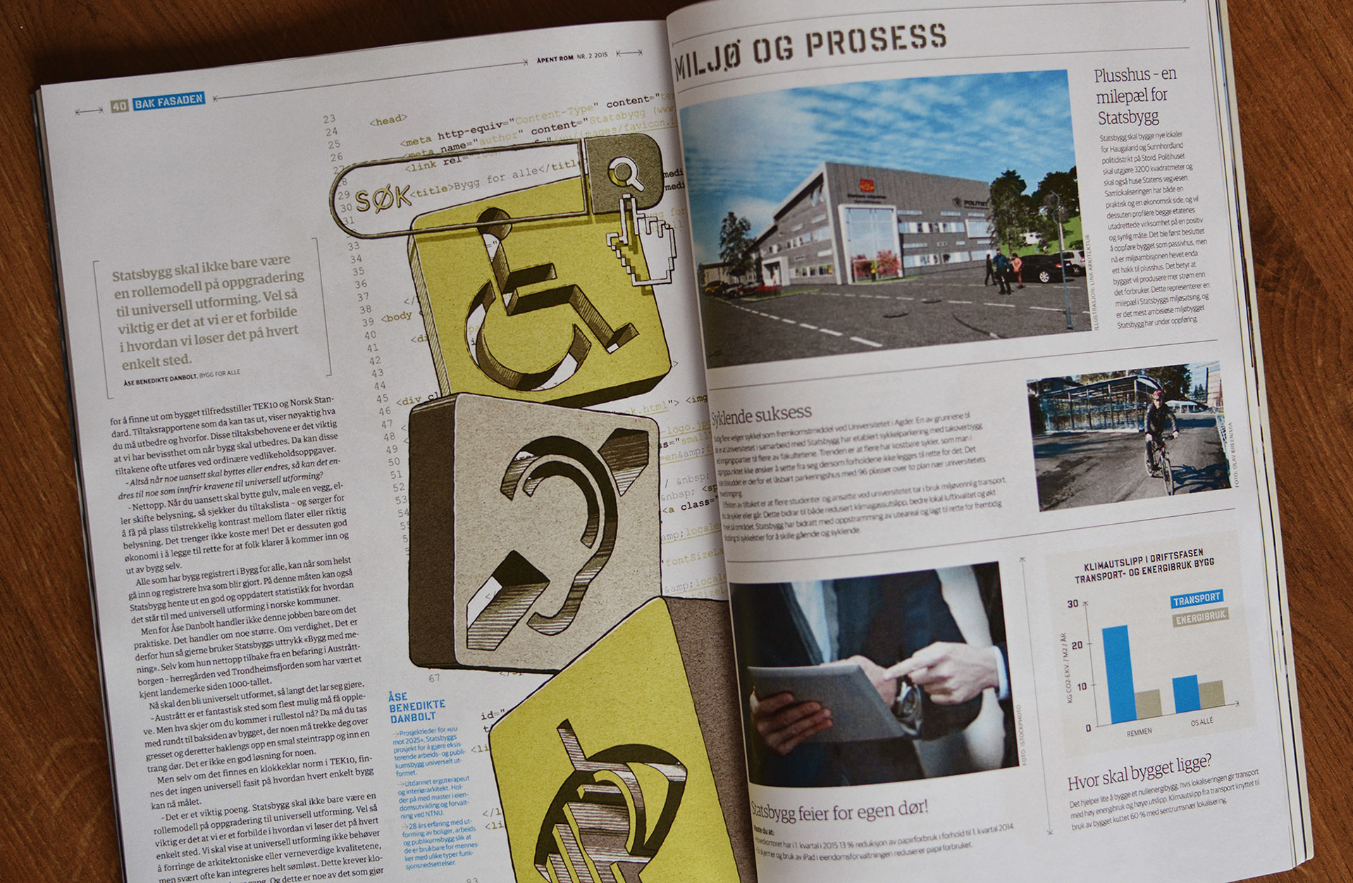 A portrait of Åse Benedikte Danbolt and the illustration depicting the Bygg for Alle website (which provides information about accessibility to public spaces in most of the Norwegian public buildings ). Published in "Åpent Rom" magazine.