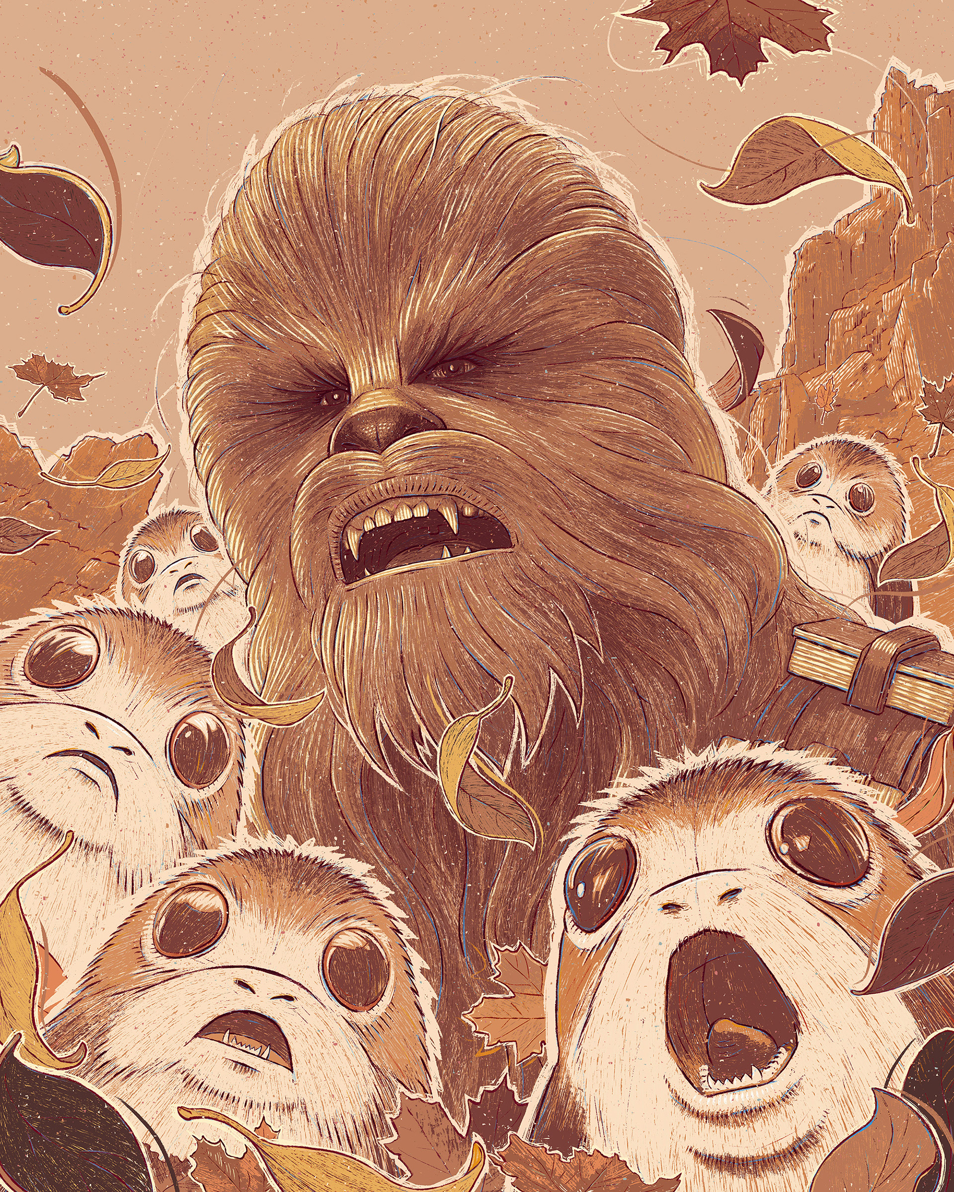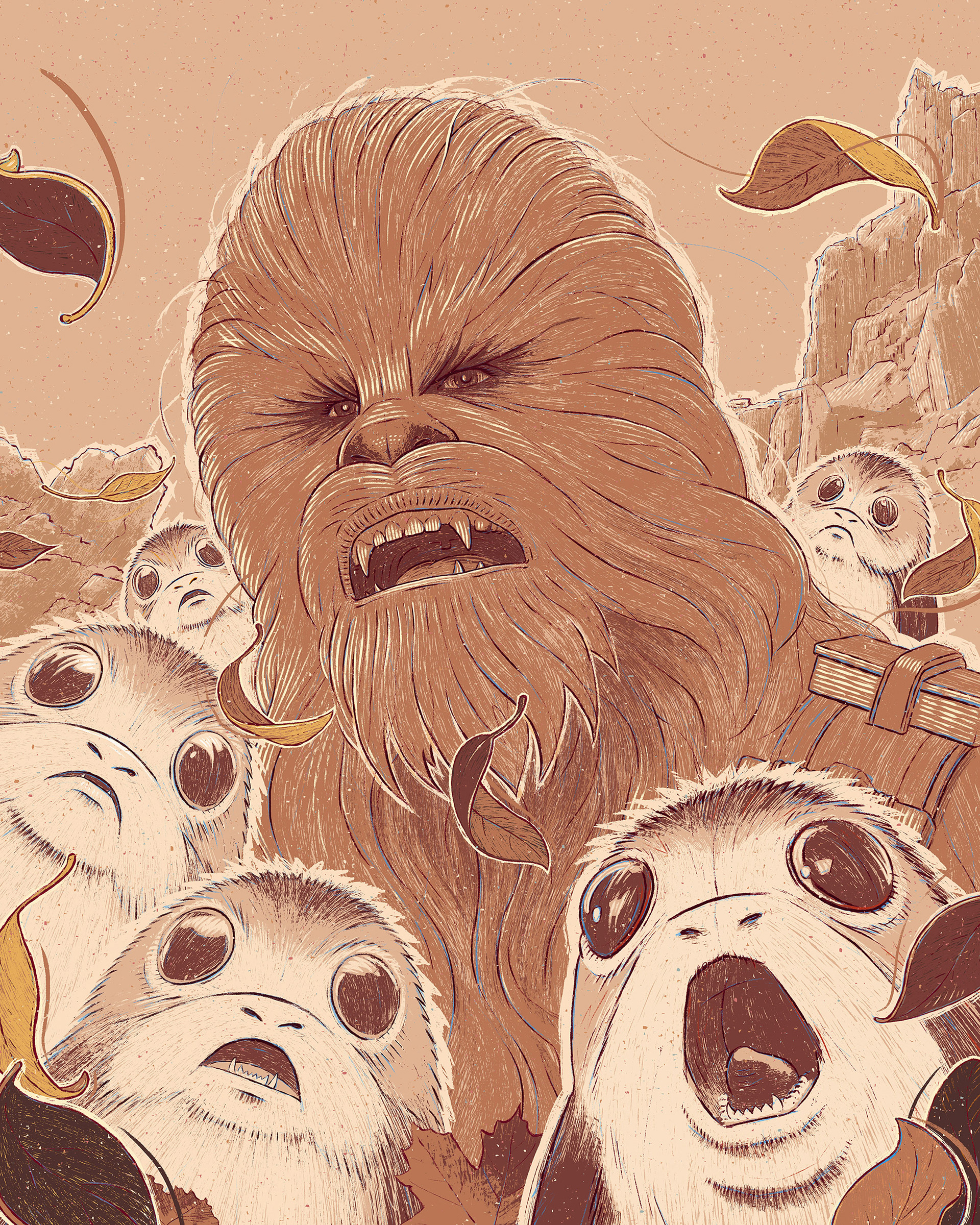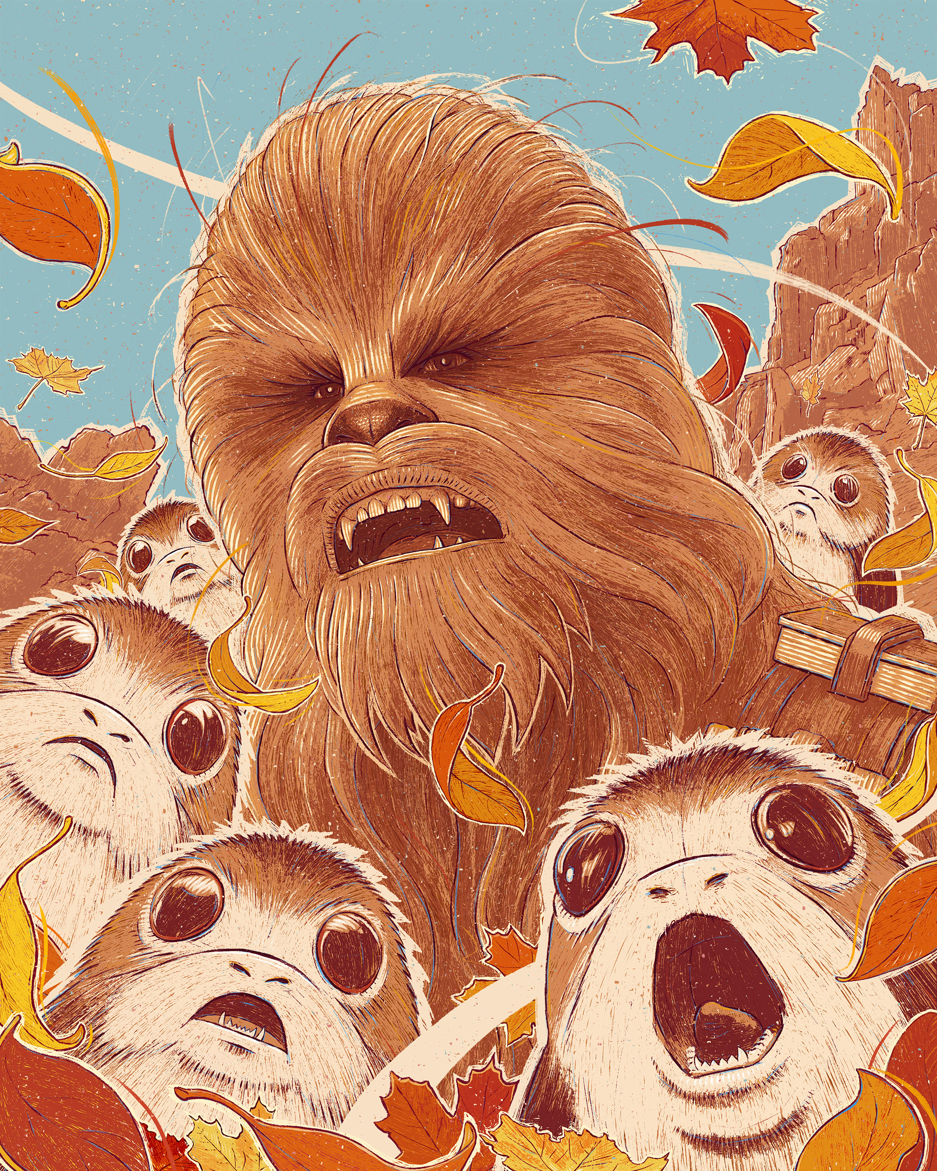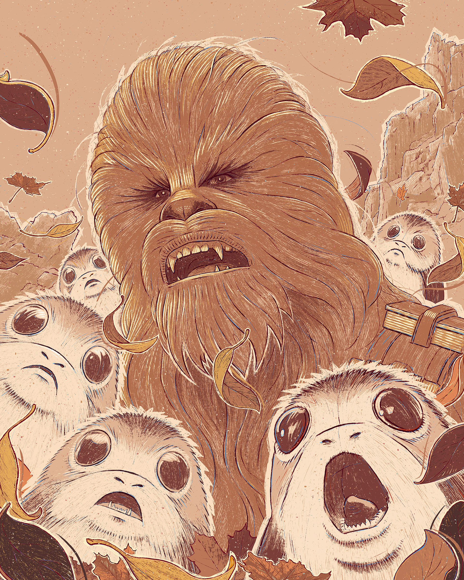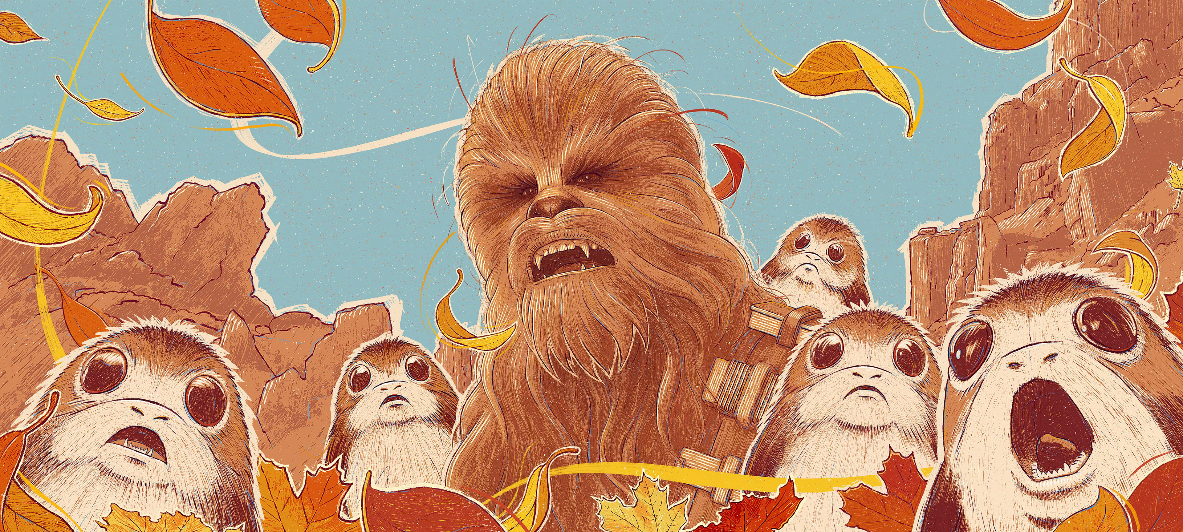 Thanksgiving Chewie and Porgs illustration for Star Wars (Disney / LucasArts).