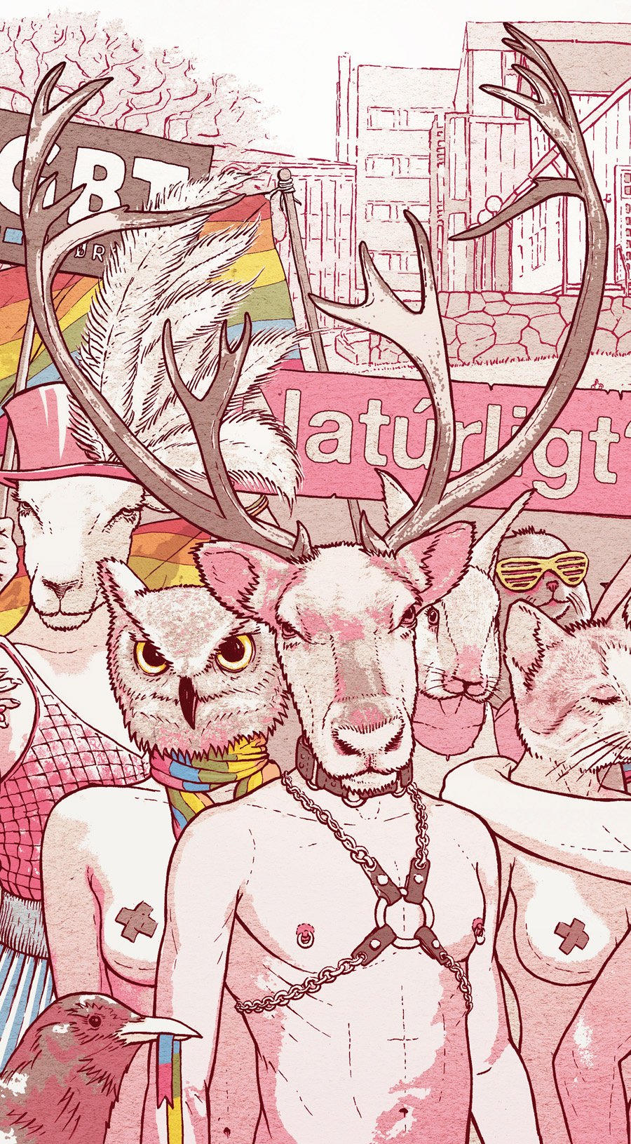 An illustration for the exhibition "Diversity of the North" organized by the LGBT Føroyar in the Faroe Islands. The exhibition organized during the local Pride challenges the assumption that homosexuality is unnatural in the light of the fact that homosexual and bisexual behaviors have been reported in hundreds of animal species (all the animals depicted in the illustration present homo- or bisexual behaviour).