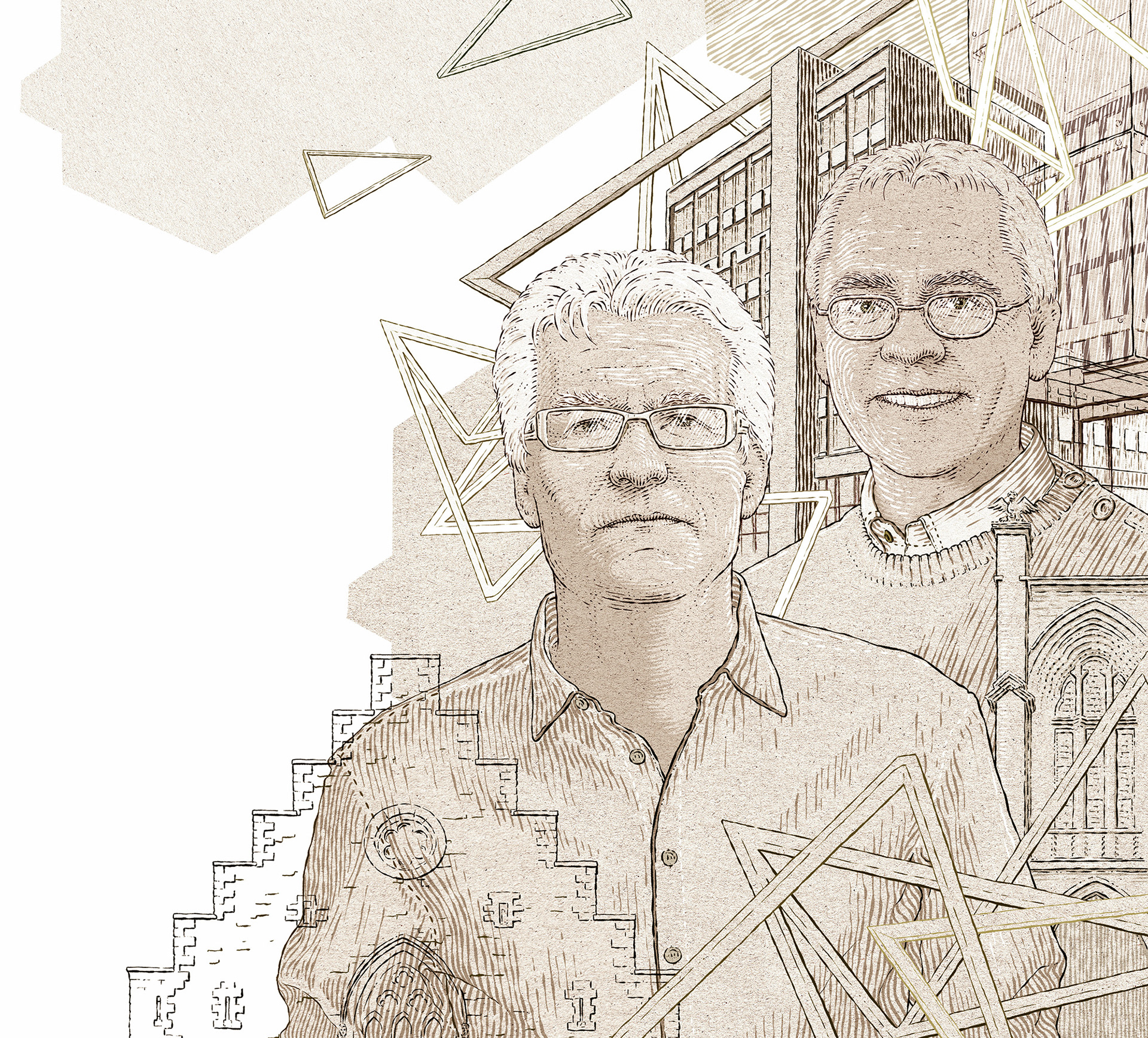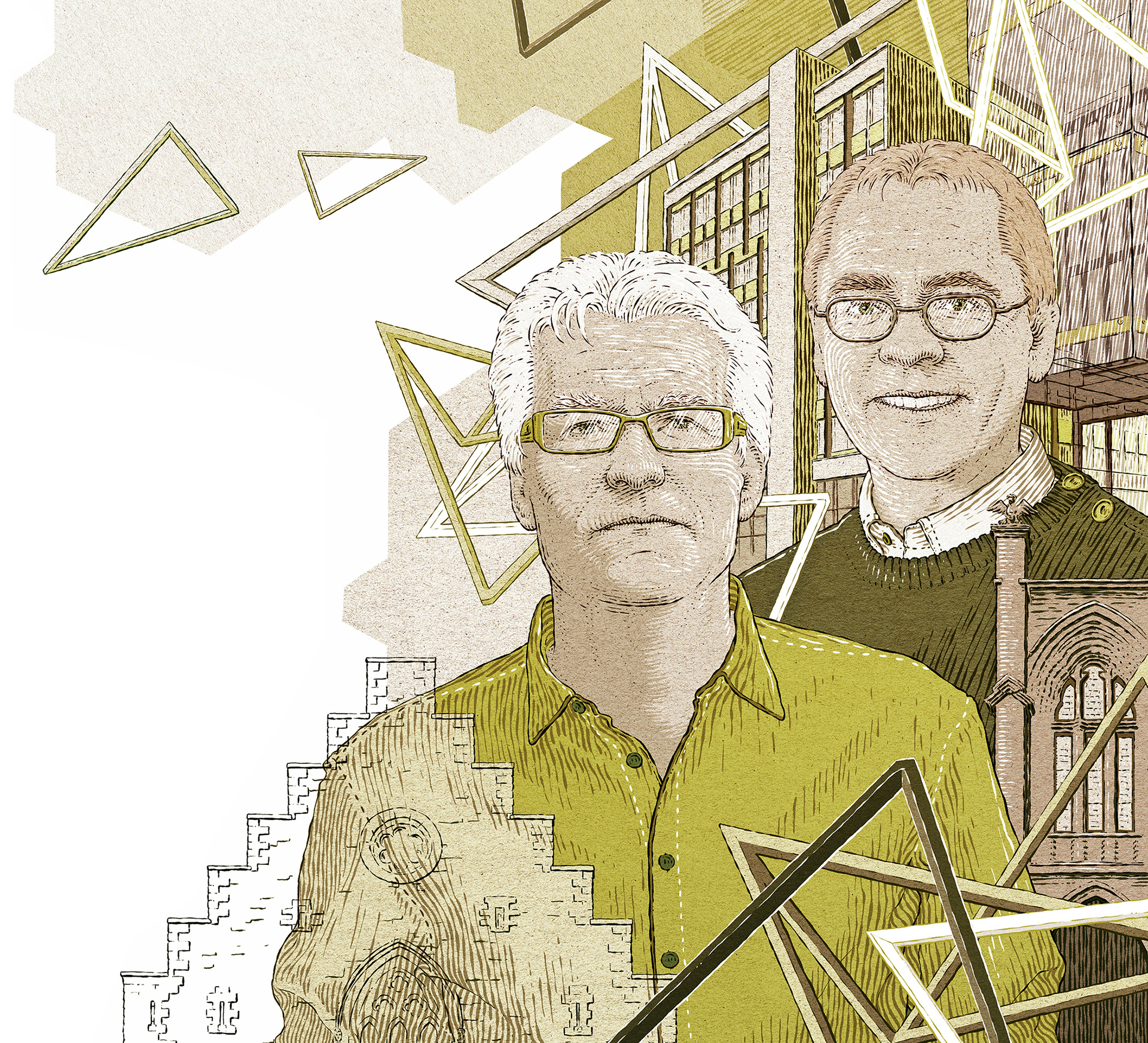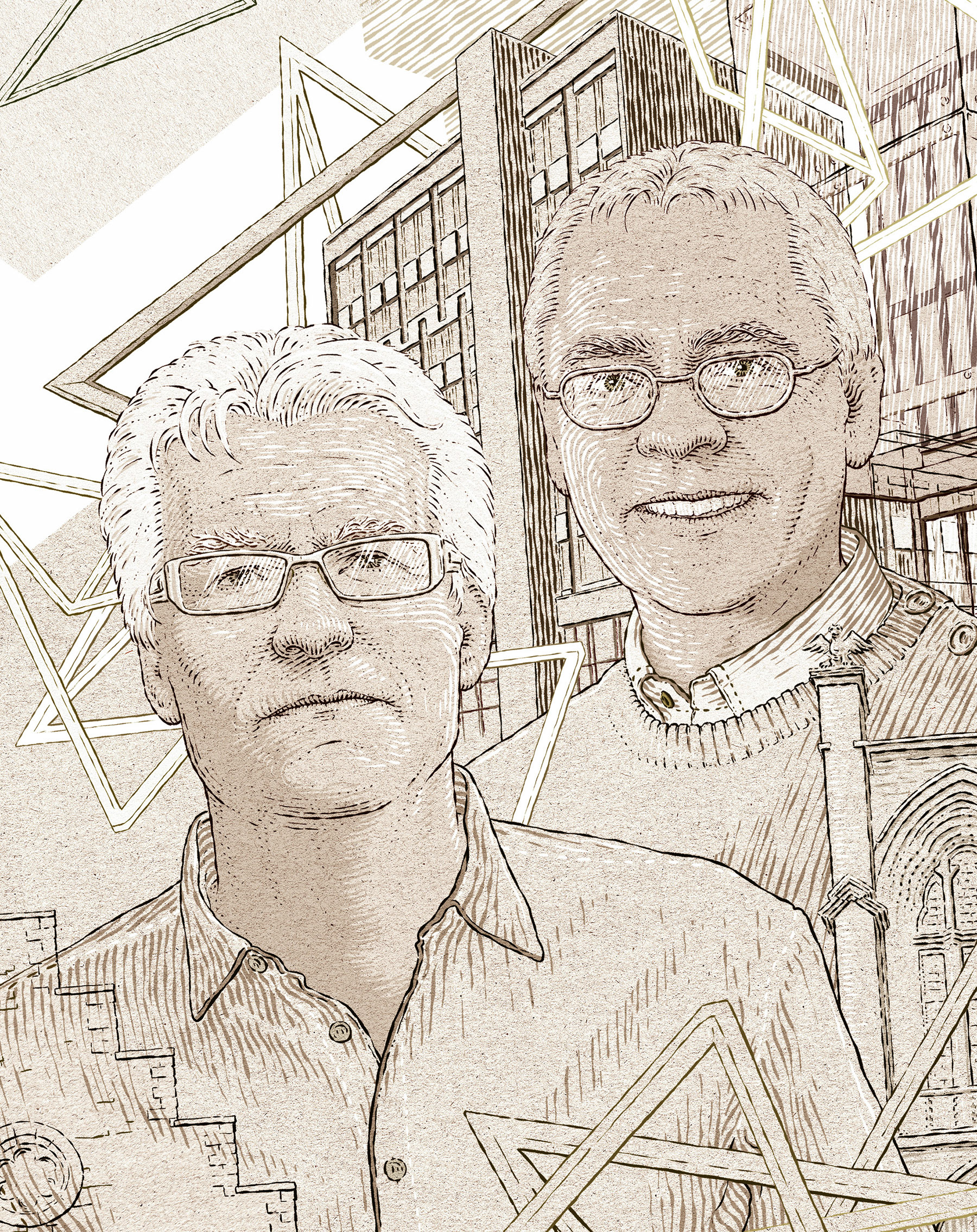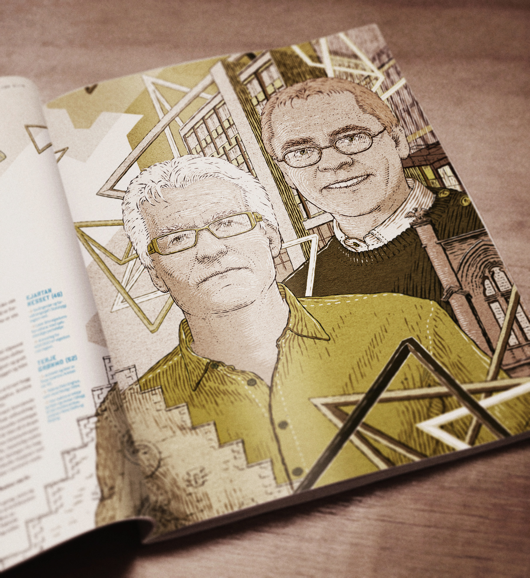 A double portrait of Terje Grønmo and Kjartan Nesset together with the architecture illustration of the Gulating building for "Åpent Rom" magazine.