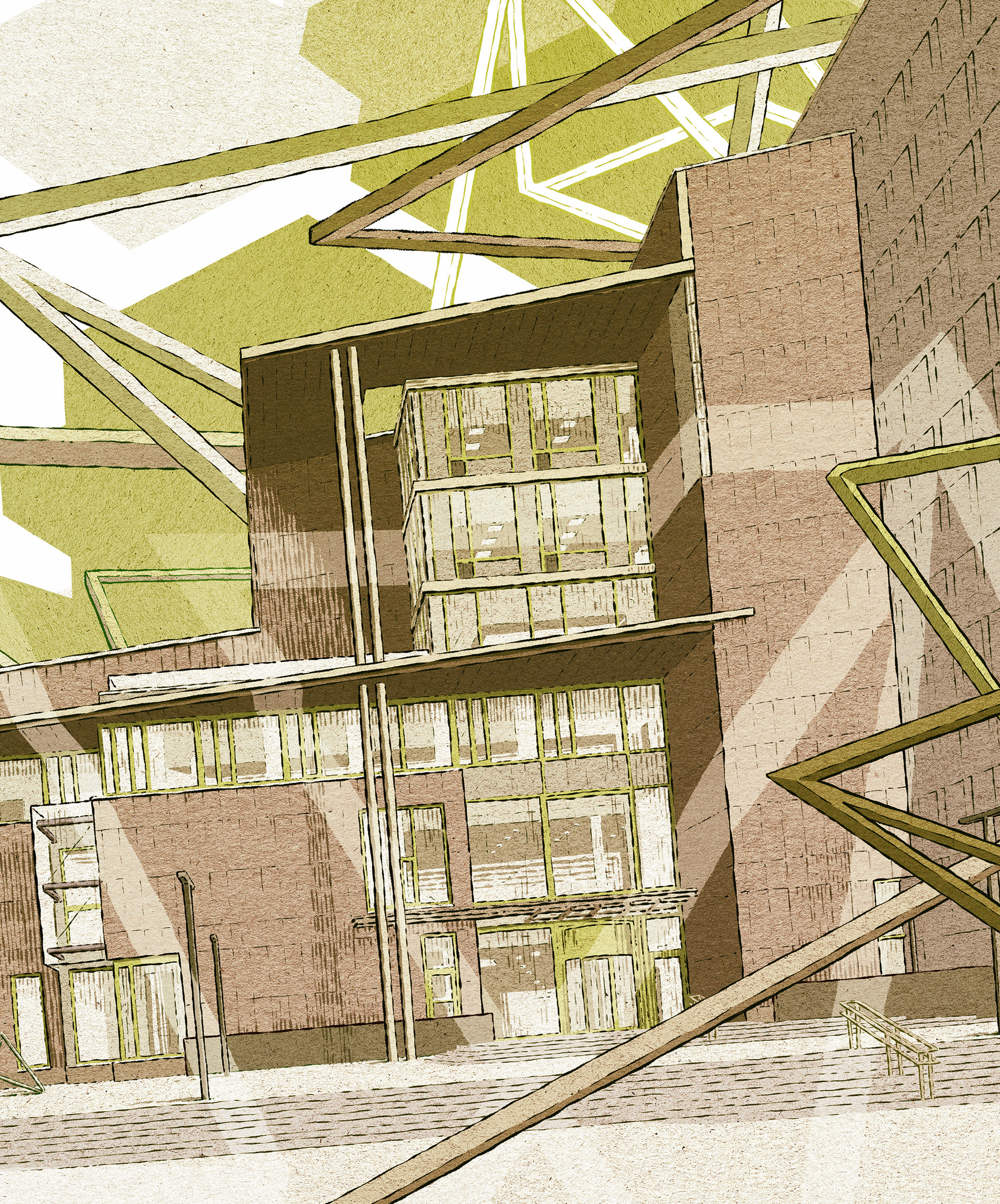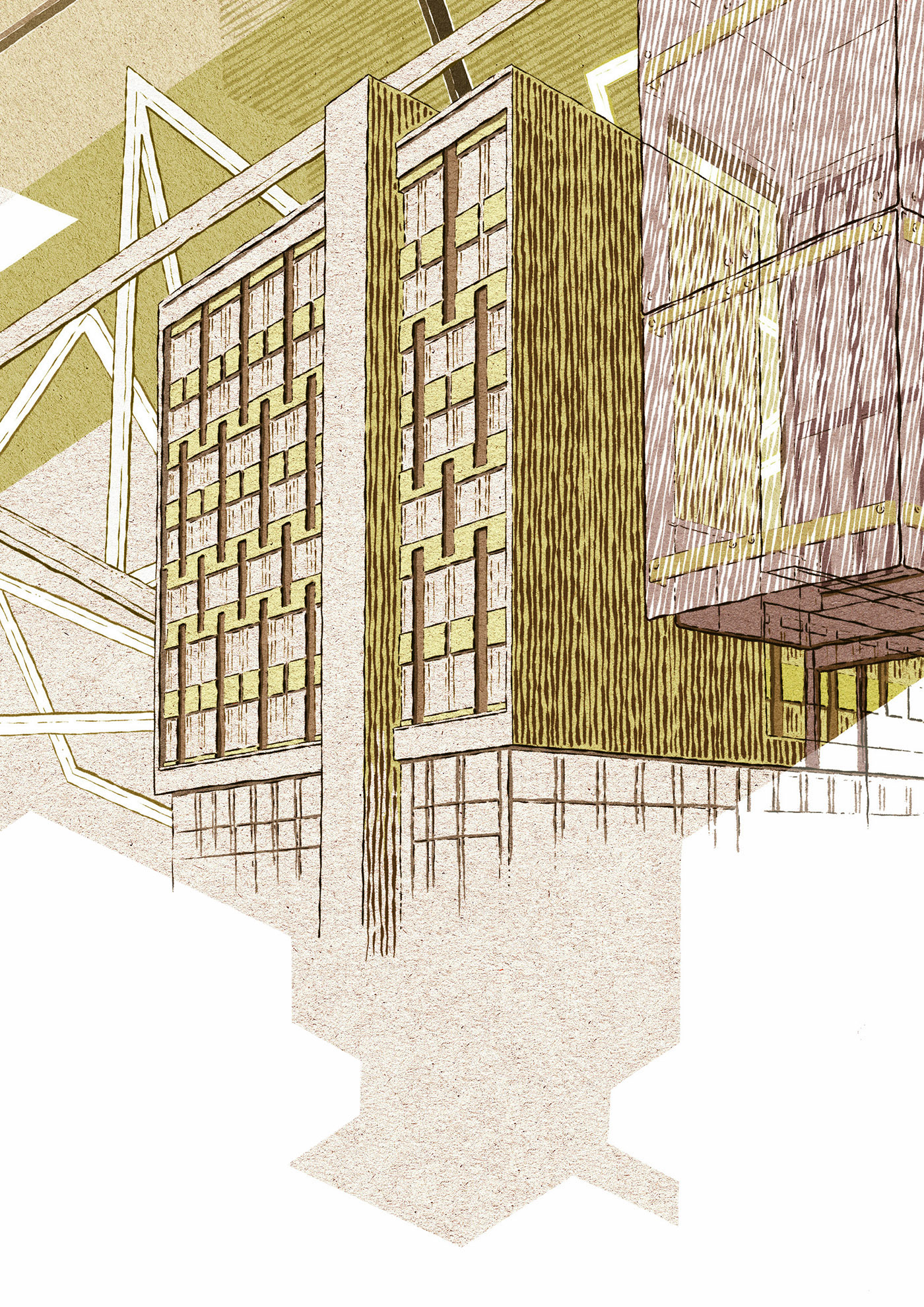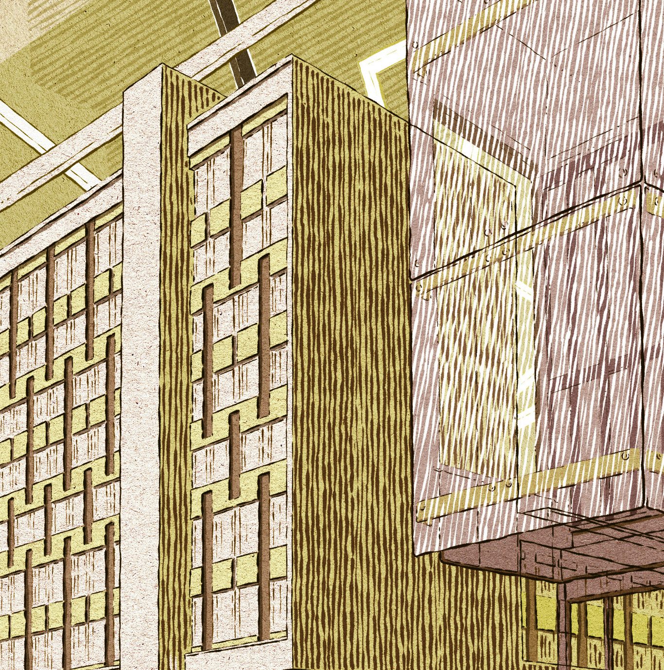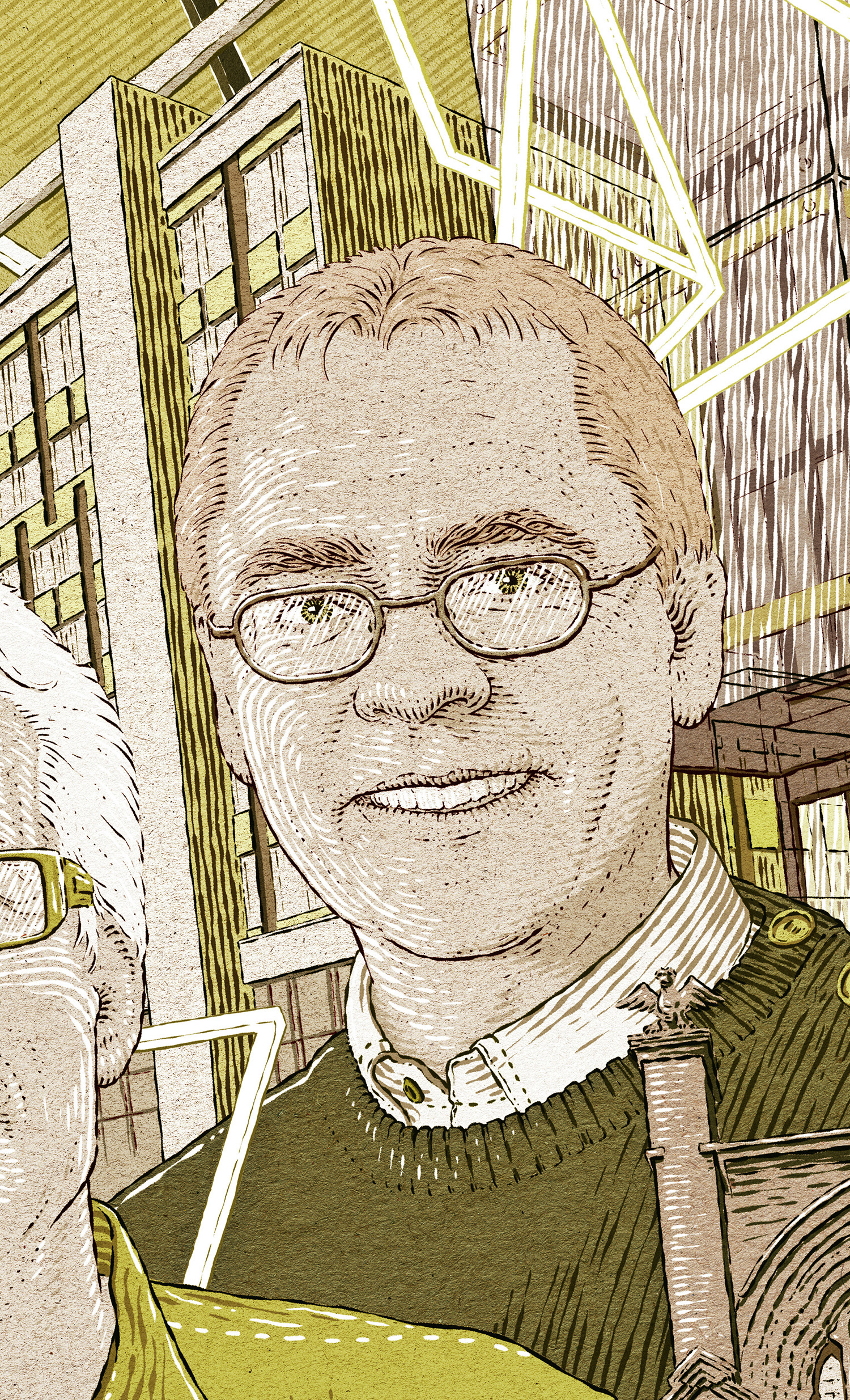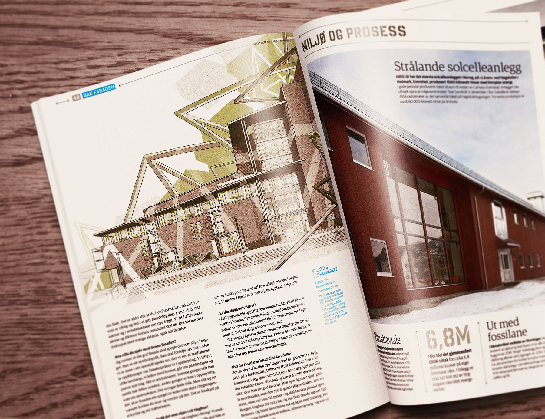 A double portrait of Terje Grønmo and Kjartan Nesset together with the architecture illustration of the Gulating building for "Åpent Rom" magazine.