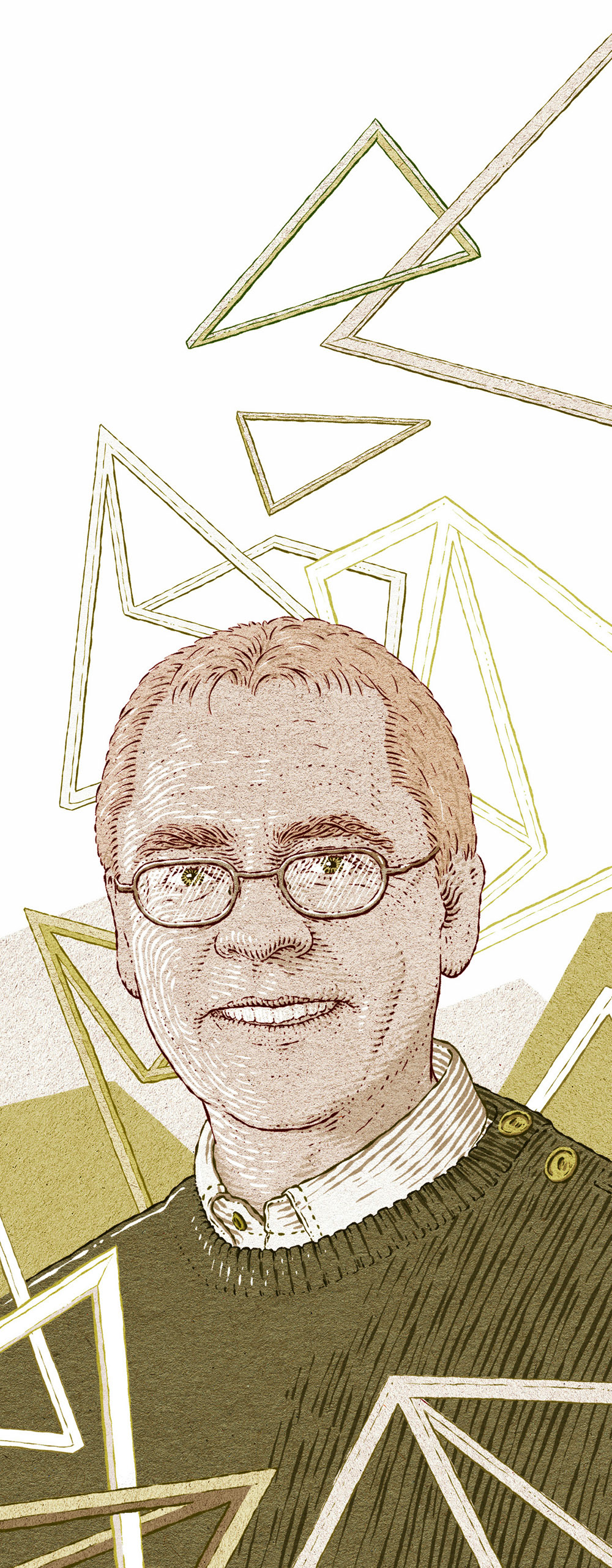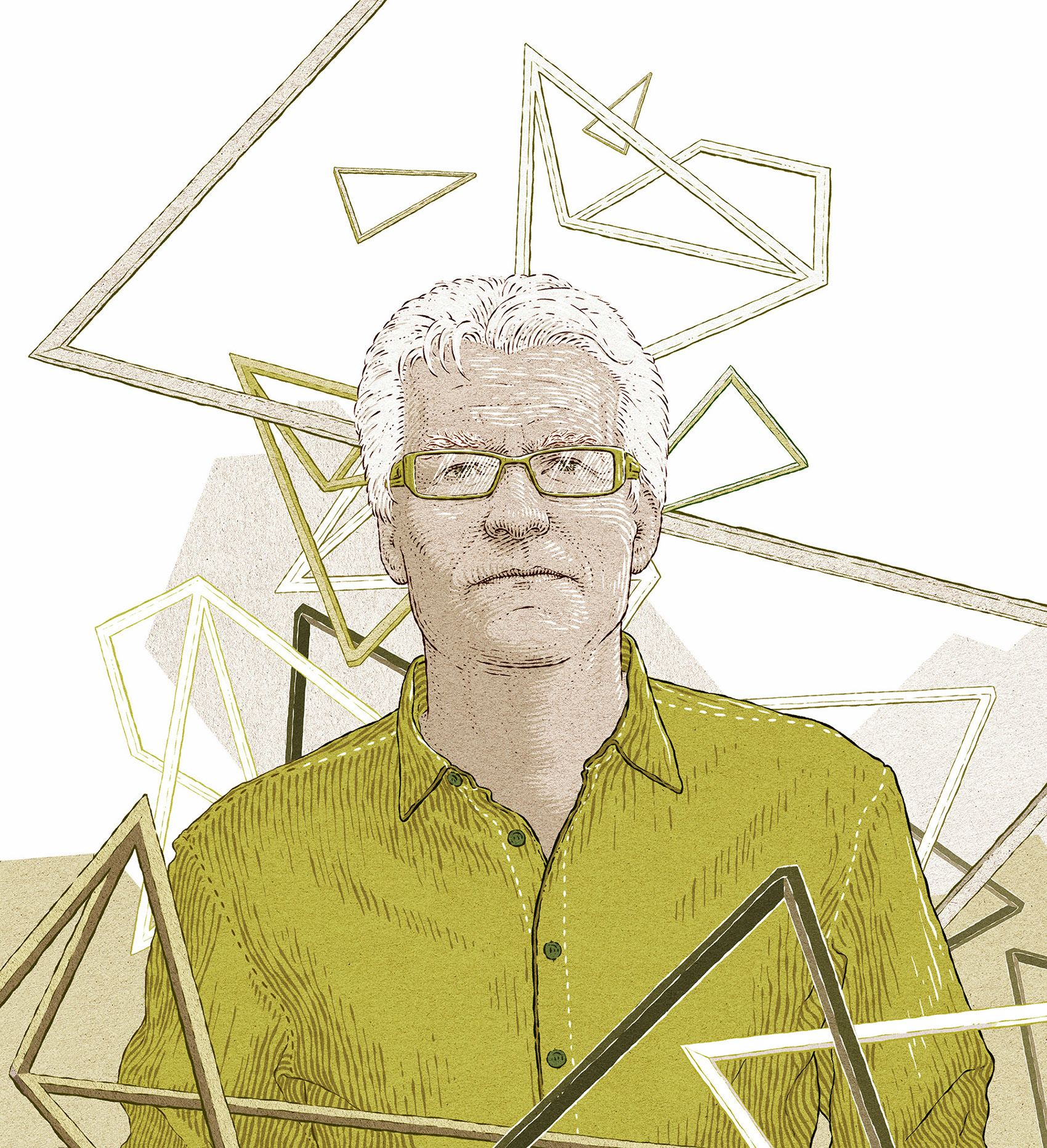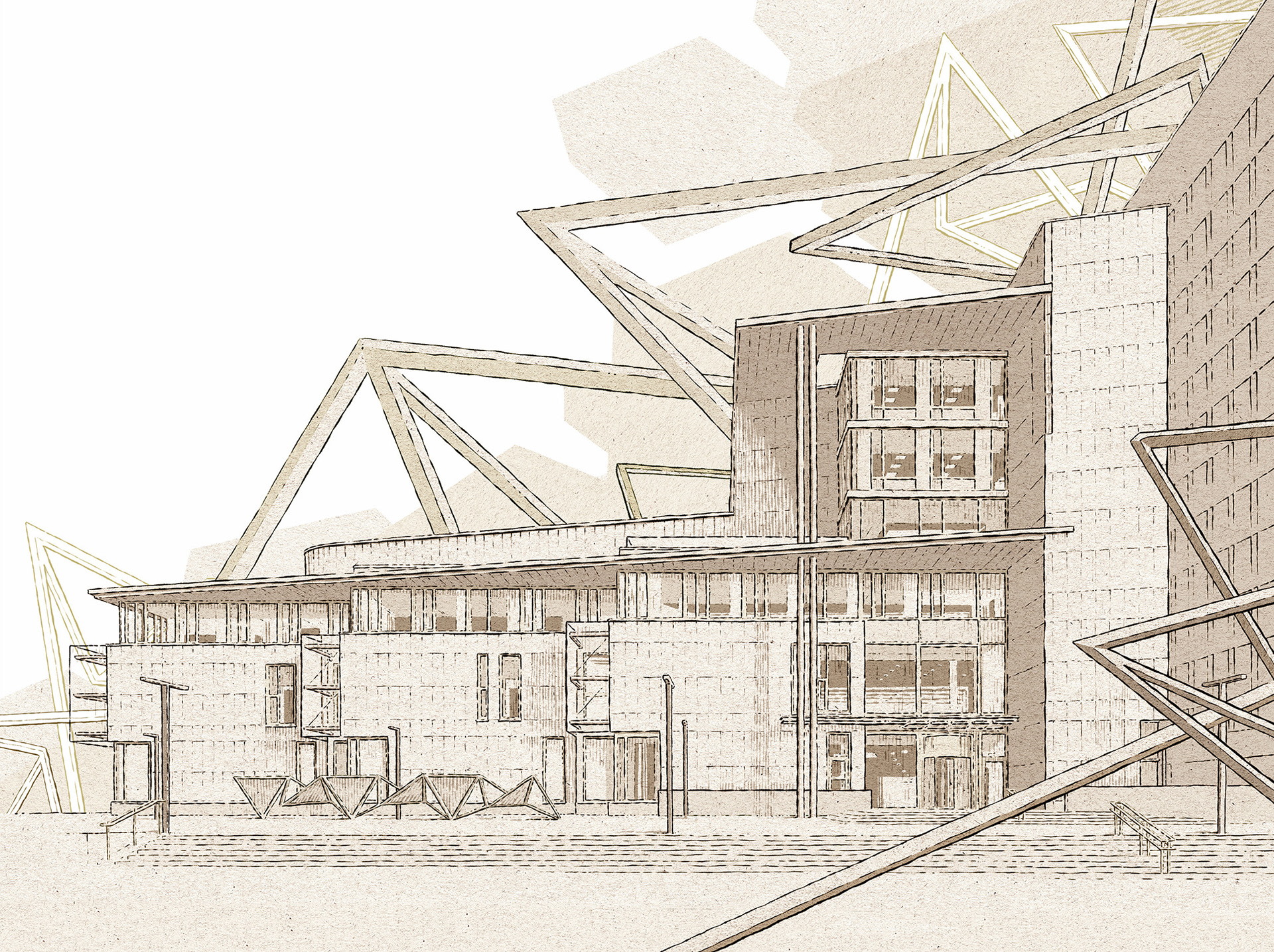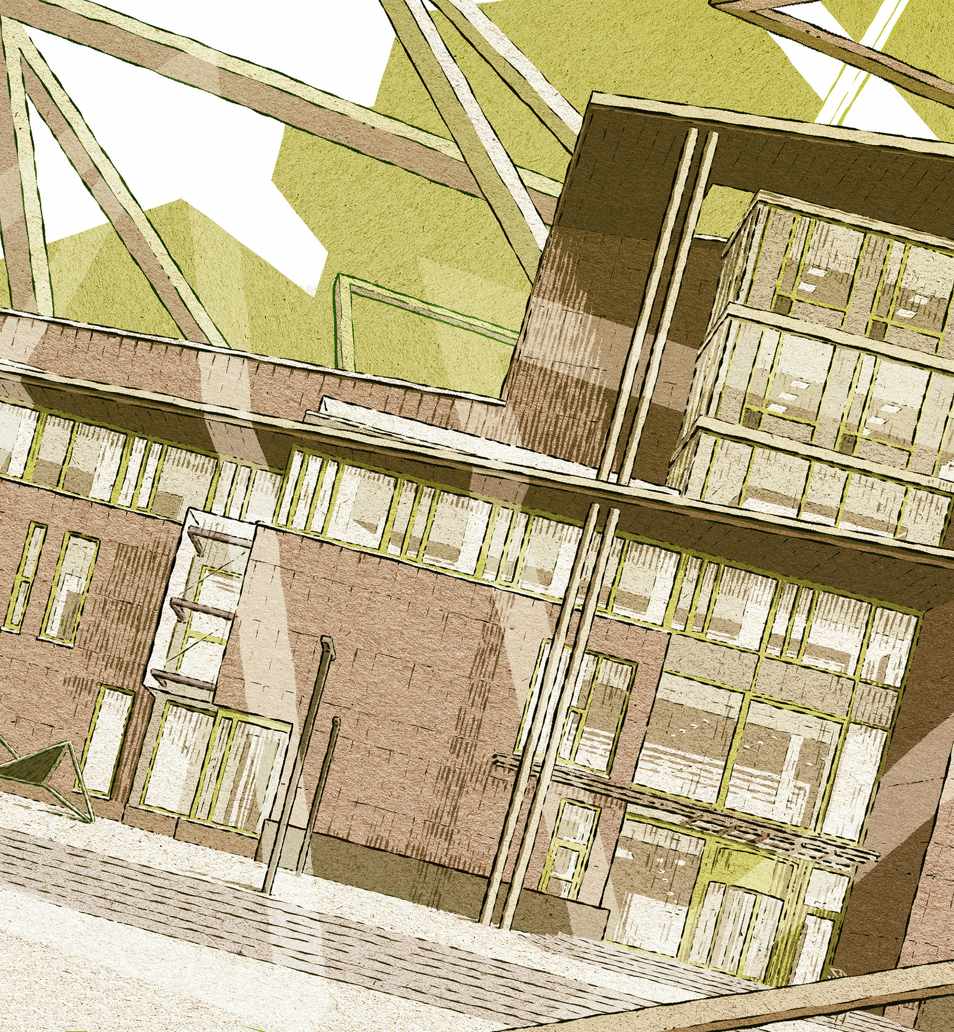 A double portrait of Terje Grønmo and Kjartan Nesset together with the architecture illustration of the Gulating building for "Åpent Rom" magazine.