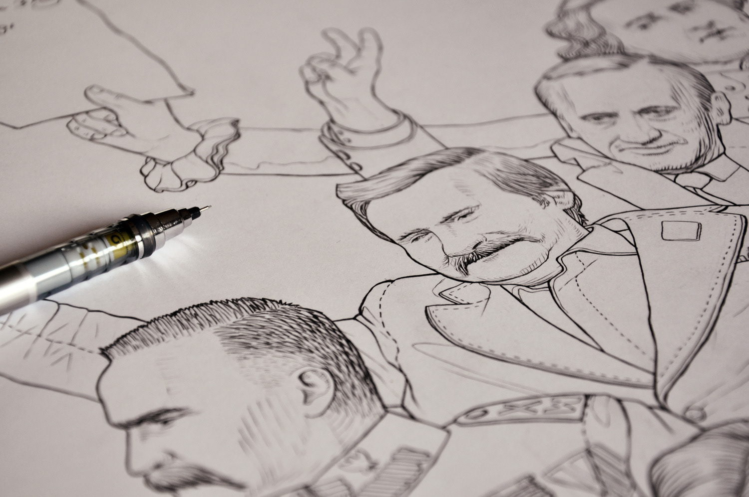 Cover illustration for "Przekroj" magazine. The feature article was about Polish national holidays and the way Poles celebrate them. The people in the cover are Jozef Pilsudski, Lech Walesa, Tadeusz Mazowiecki and Stanislaw Malachowski and they are all connceted with Polish historical events.