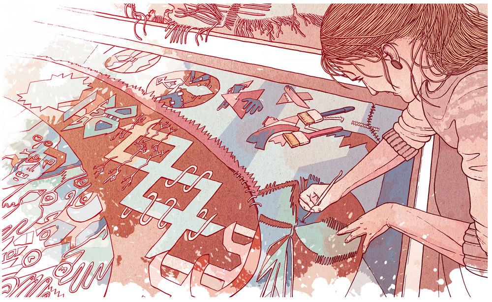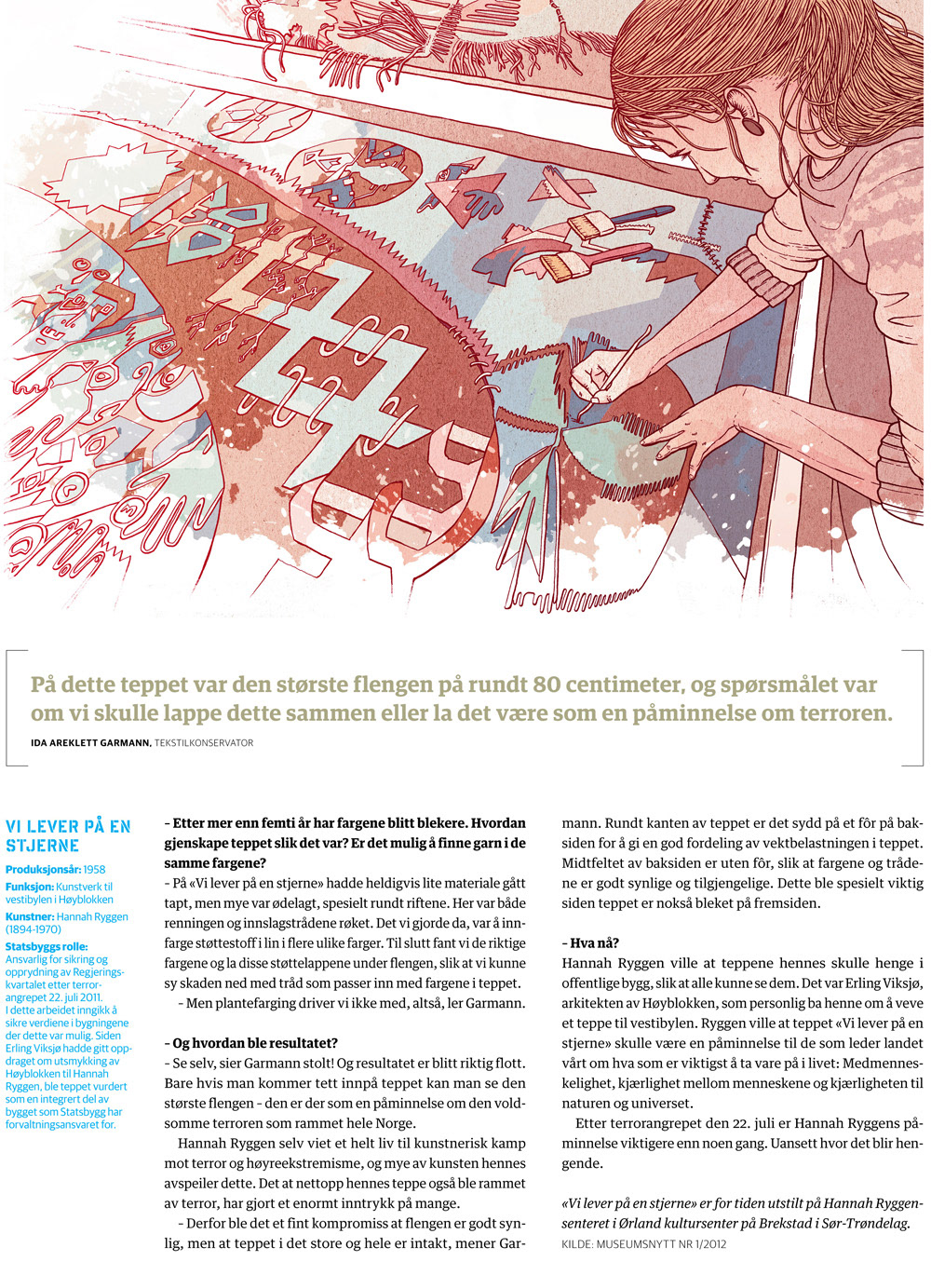 A portrait and an illustration for a Norwegian magazine "Åpent Rom" published by Statsbygg - the Norwegian government's key advisor in construction and property affairs. The article it illustrated was about the restoration of the 3 x 4 meters carpet by Hannah Ryggen, which was destroyed in Oslo bombing in July 2011. The portrayed girl is Ida Areklett Garmann - a conservator who restored the piece.