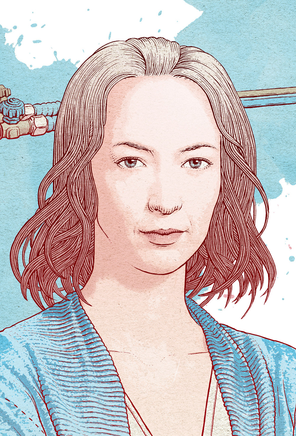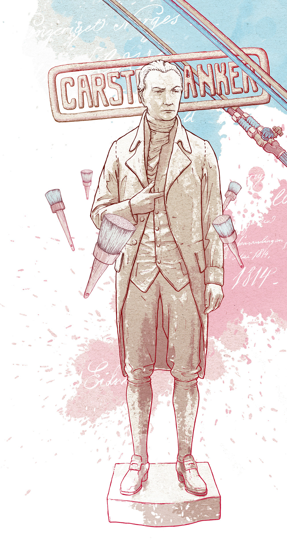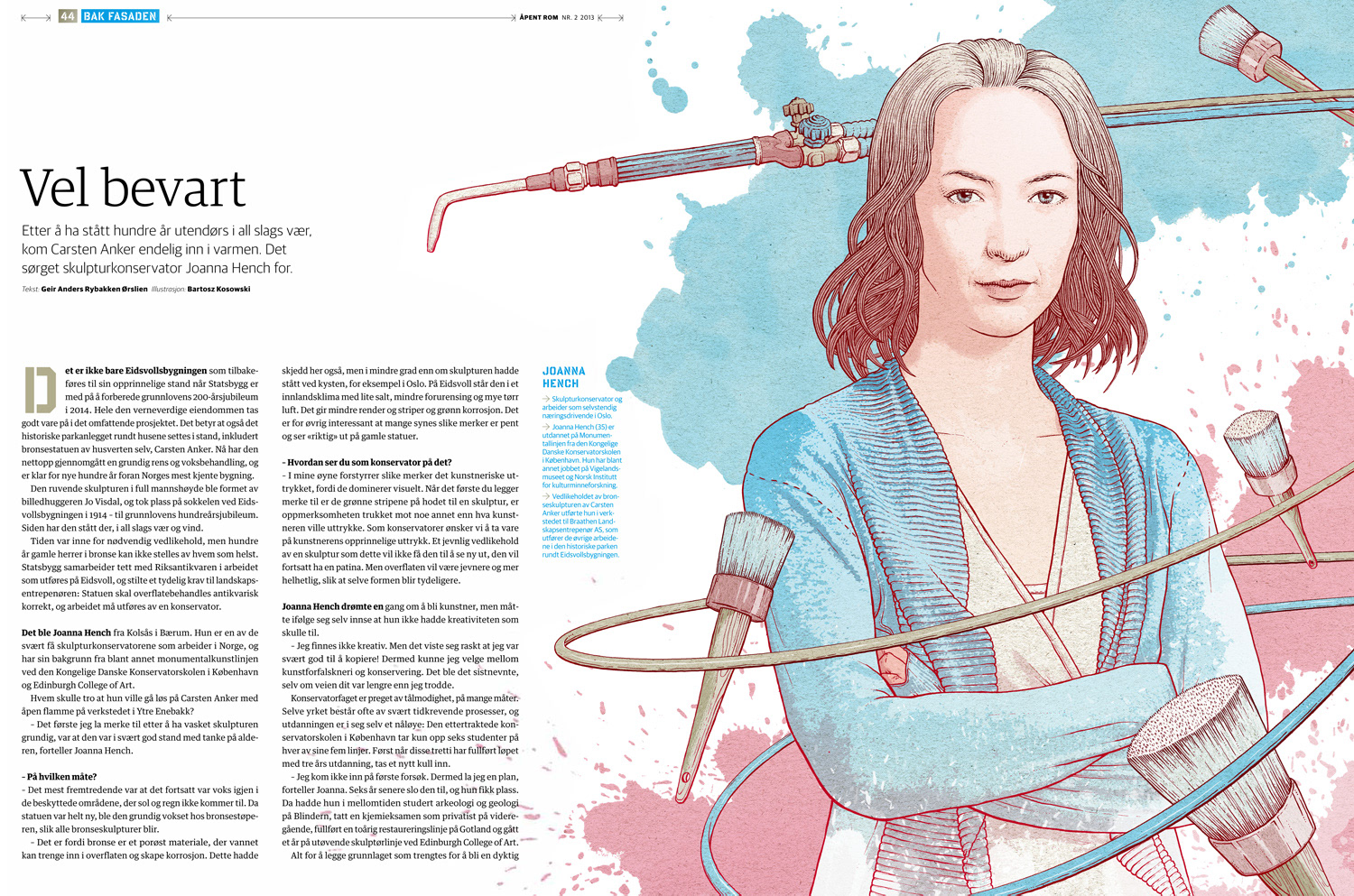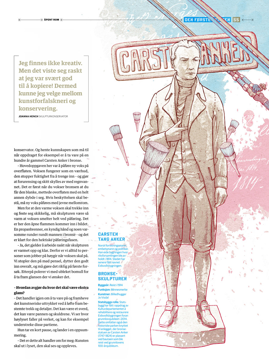 A portrait of a sculpture curator Joanna Hench and an illustration of Carsten Anker statue for a Norwegian magazine "Åpent Rom" published by Statsbygg.