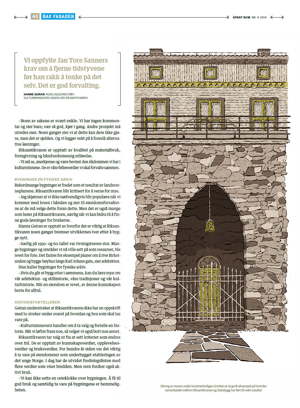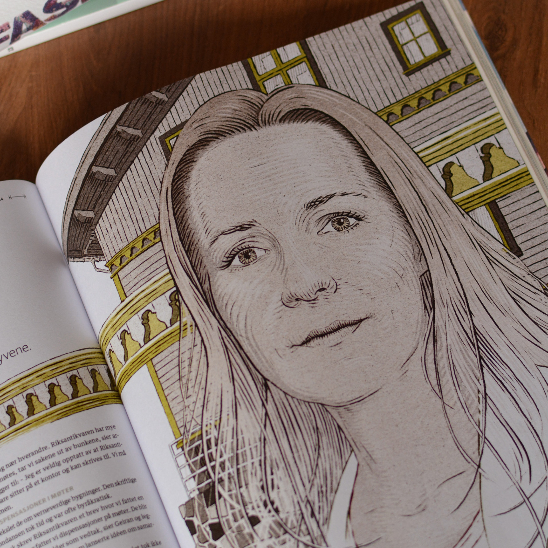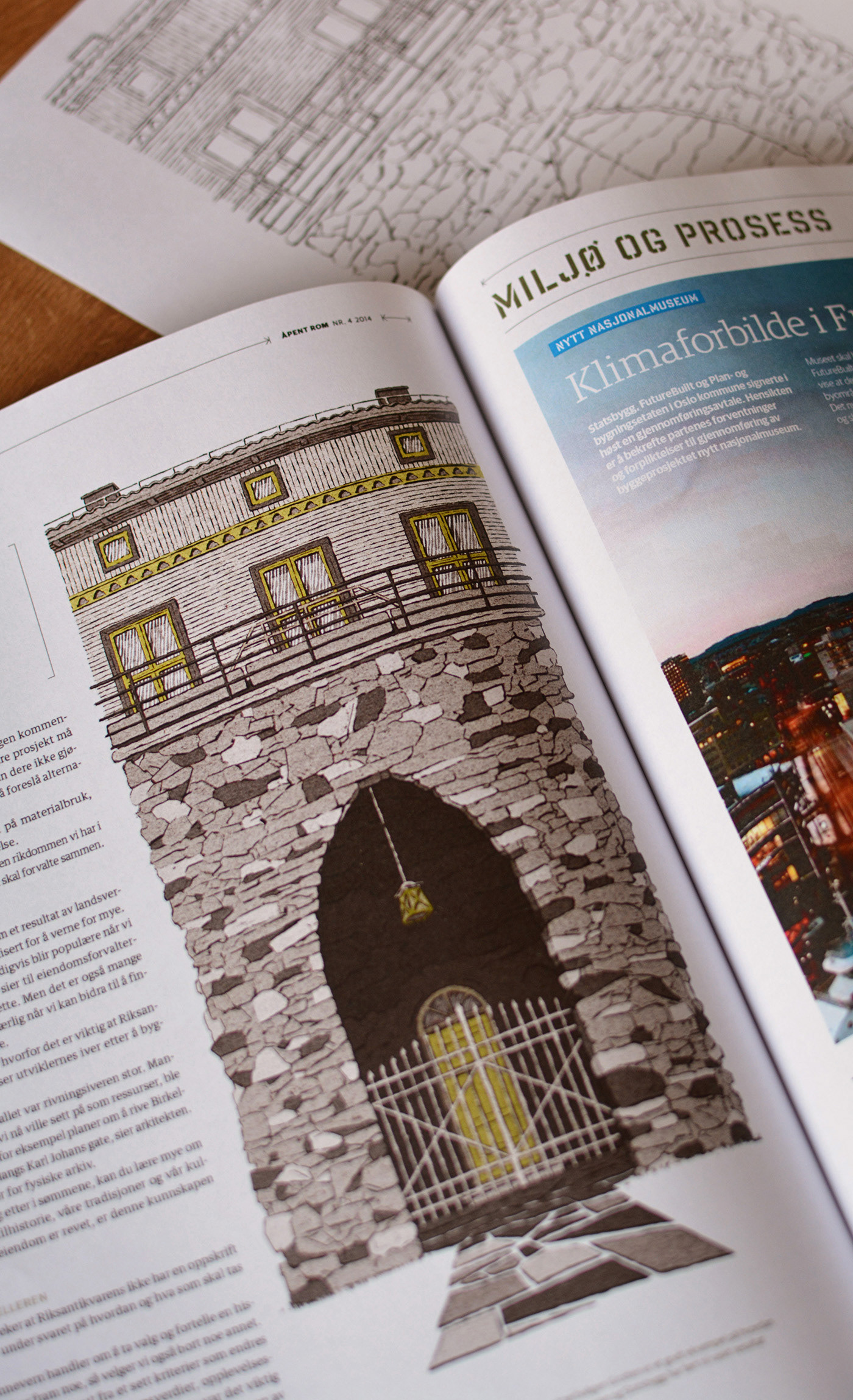 A portrait of Hanna Geiran and the architecture illustration of the Oslo Grotten for "Åpent Rom" magazine.