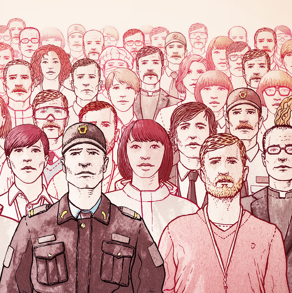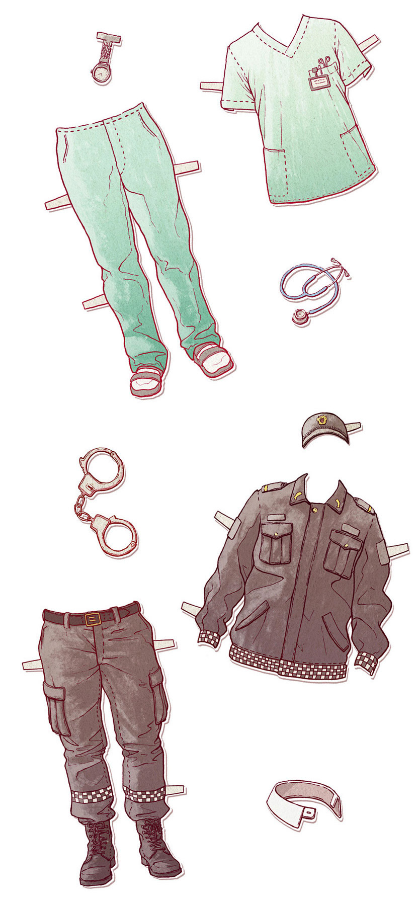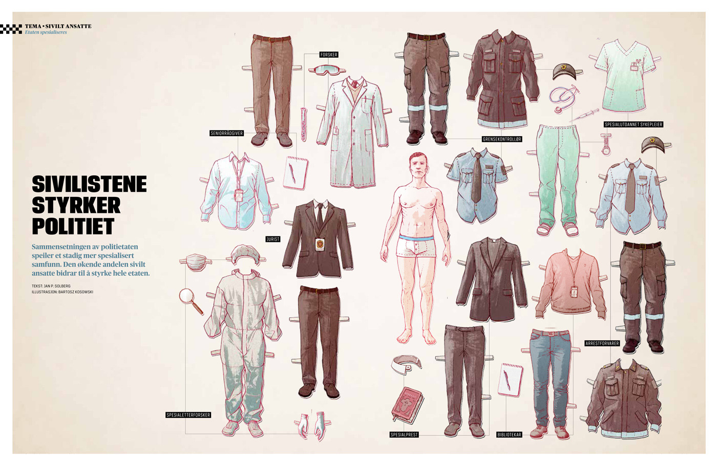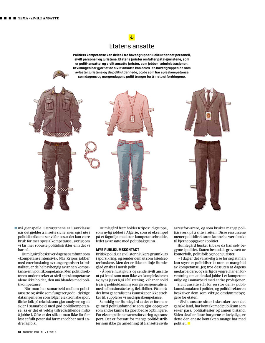 Cover and inside illustrations for the Norwegian Police magazine. The feature article describes different jobs in the police force.